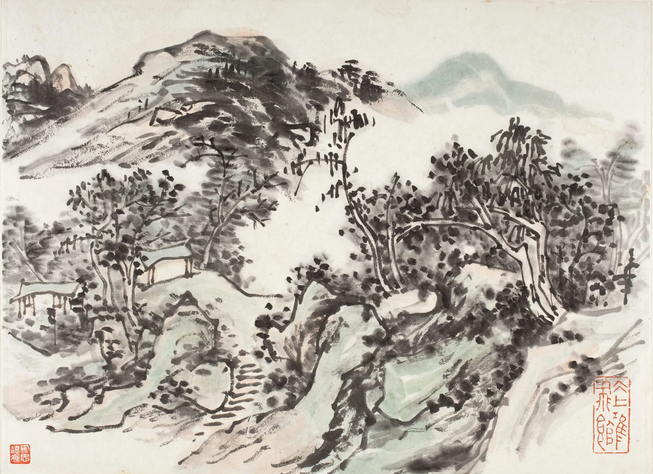 Ink and light color landscape painting on paper, mountainous scene with gnarled trees, a small pavilion, and misty peaks rendered in gestural brushwork with pale green and gray washes