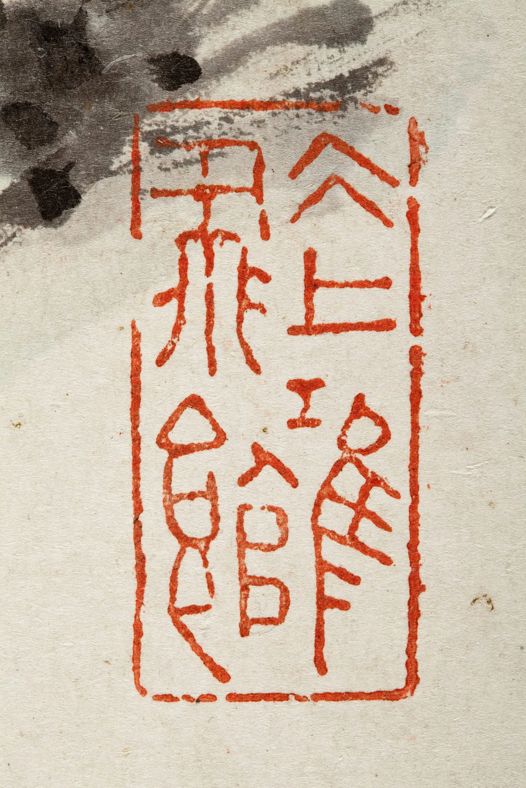 Close-up of a red seal impression in Chinese seal script on cream-colored paper, with ink wash brushwork visible at the upper edge.
