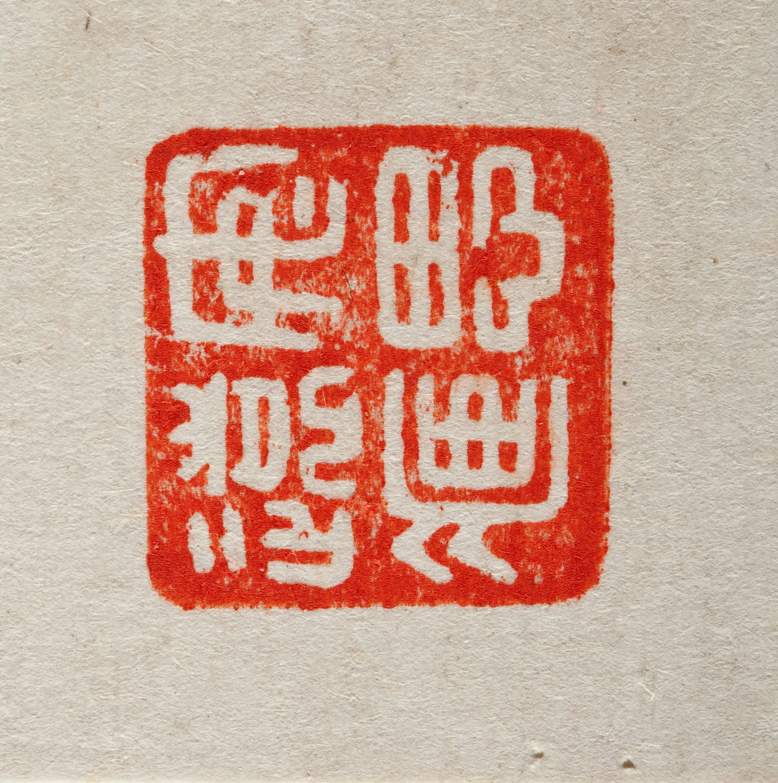 Red ink seal impression on cream paper, square format with rounded corners, featuring four Chinese seal-script characters in white reserve against vermilion ground, with slightly uneven ink coverage.