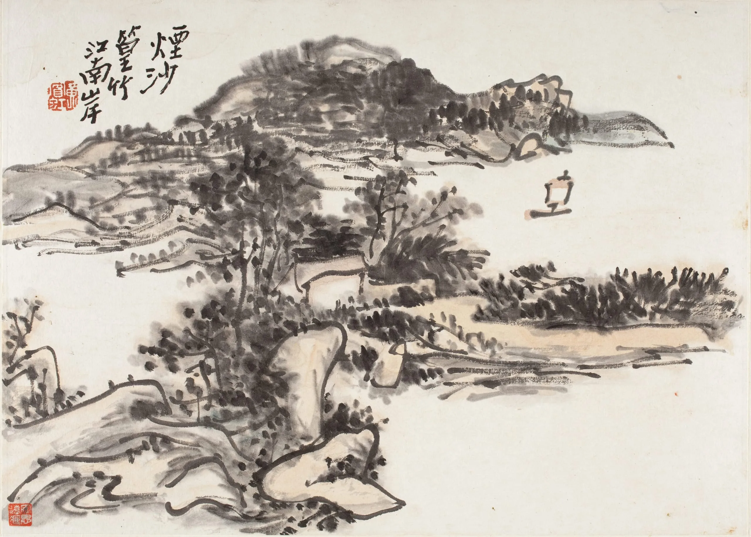 Horizontal Chinese ink landscape with bold brushwork, depicting rocky foreground, tree-covered hills, a mountain, and an open expanse of water with a small boat, with inscriptions and red seals in the upper left