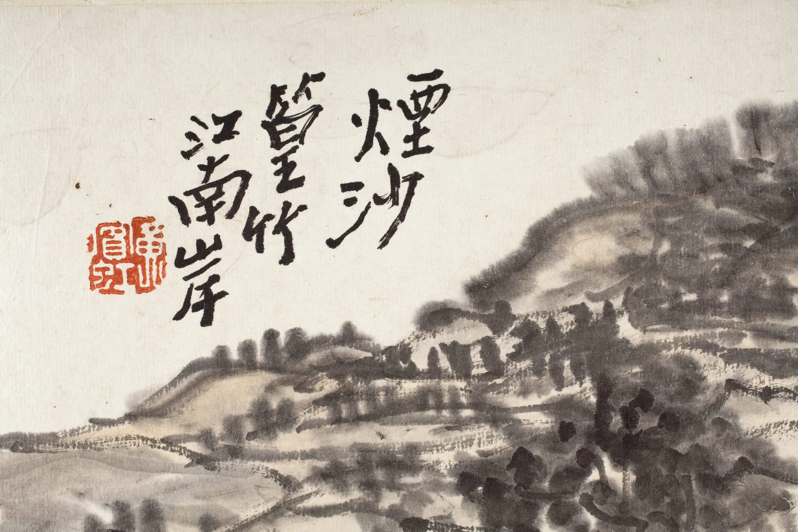 Ink wash landscape detail with a hillside and dense foliage rendered in loose, wet brushwork; columns of Chinese calligraphy and two red seal impressions at upper left.