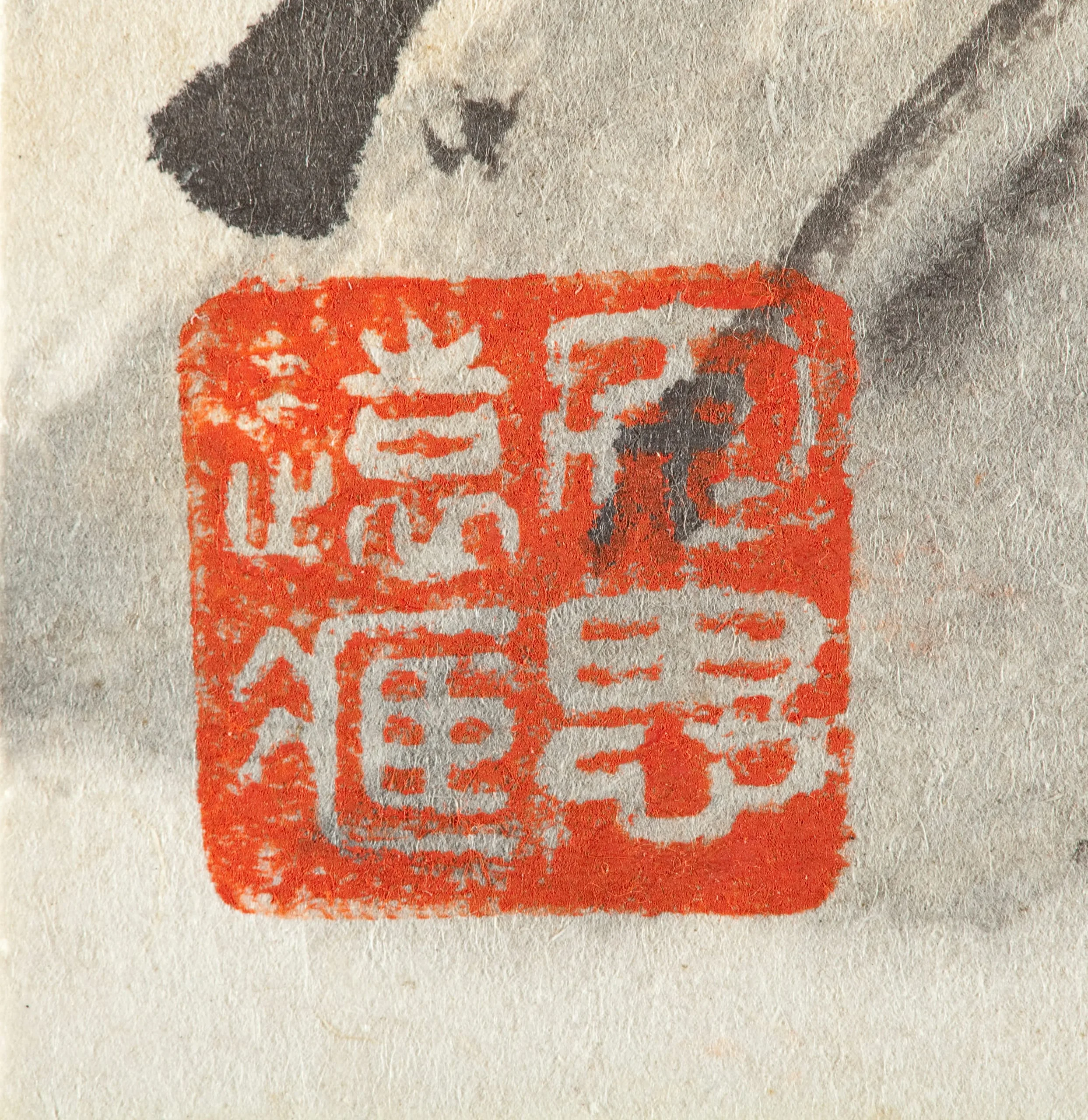 Close-up of a square red seal stamp with Chinese seal script characters in relief, printed in vermilion red on cream paper, with ink brushwork visible at upper edge.