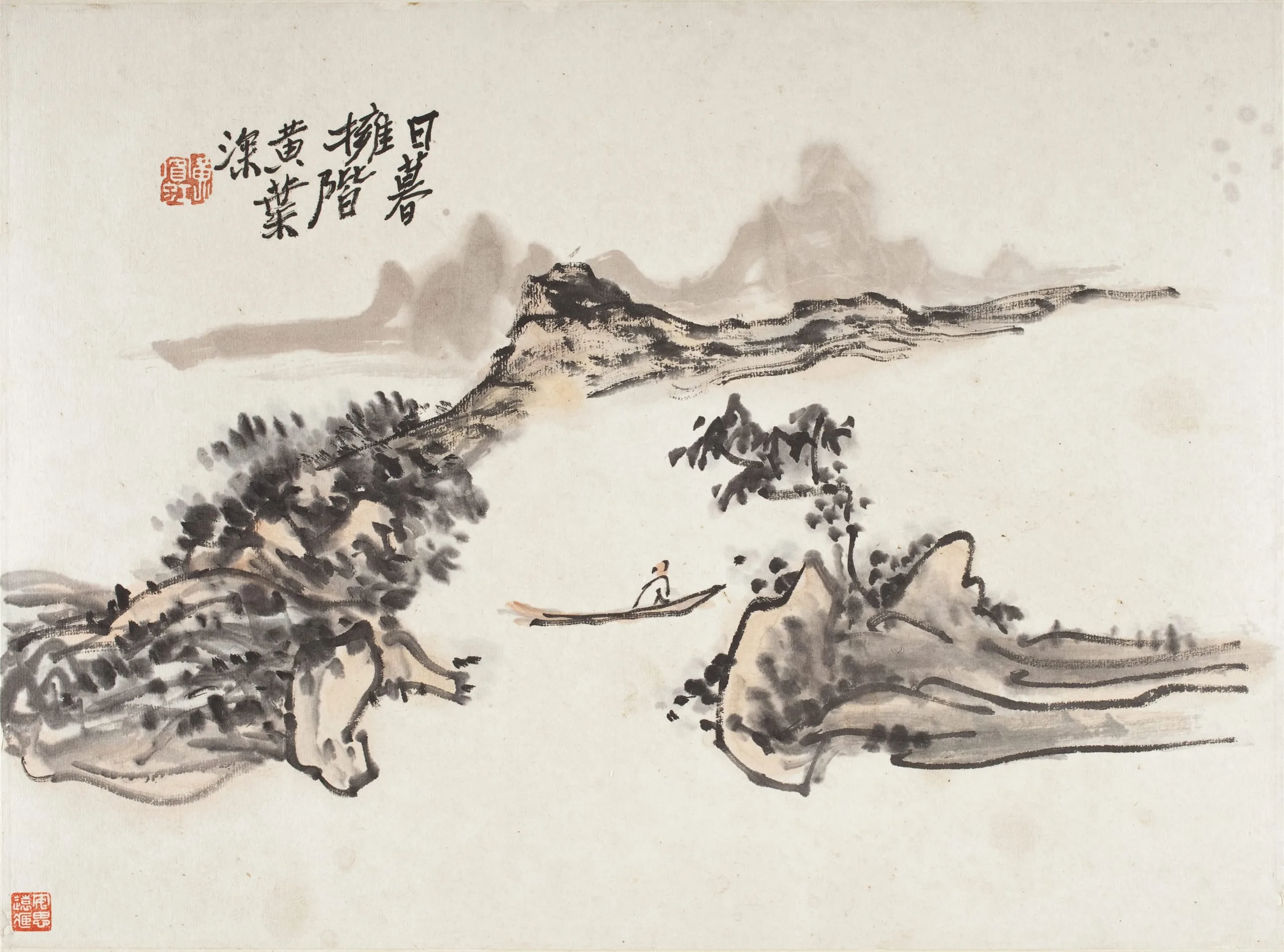 Chinese ink landscape painting on cream paper, with rocky outcroppings, ink-wash mountains, clustered trees, and a small figure in a boat on open water; two red seals and Chinese inscription at upper left