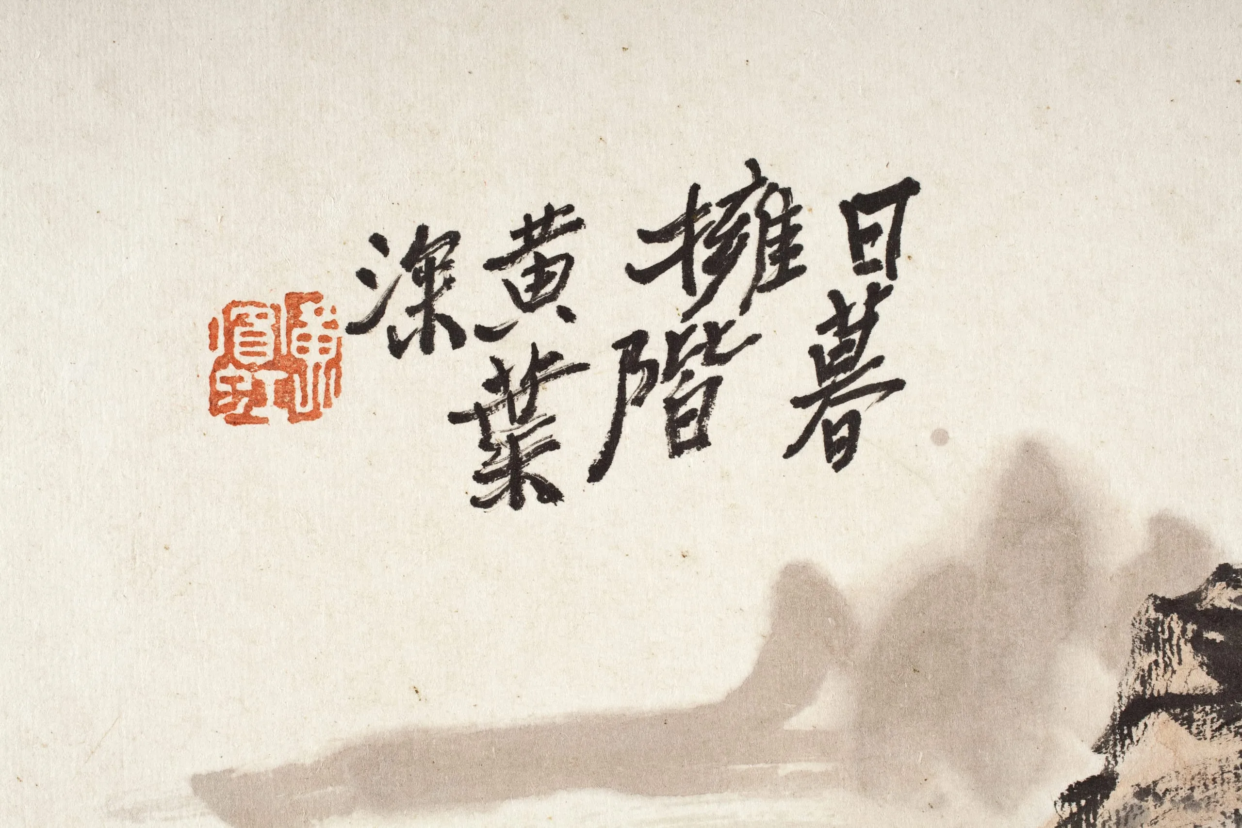 Detail of ink on paper showing two columns of Chinese calligraphy in regular script, with a red seal stamp at left and a brushwork landscape element at lower right.