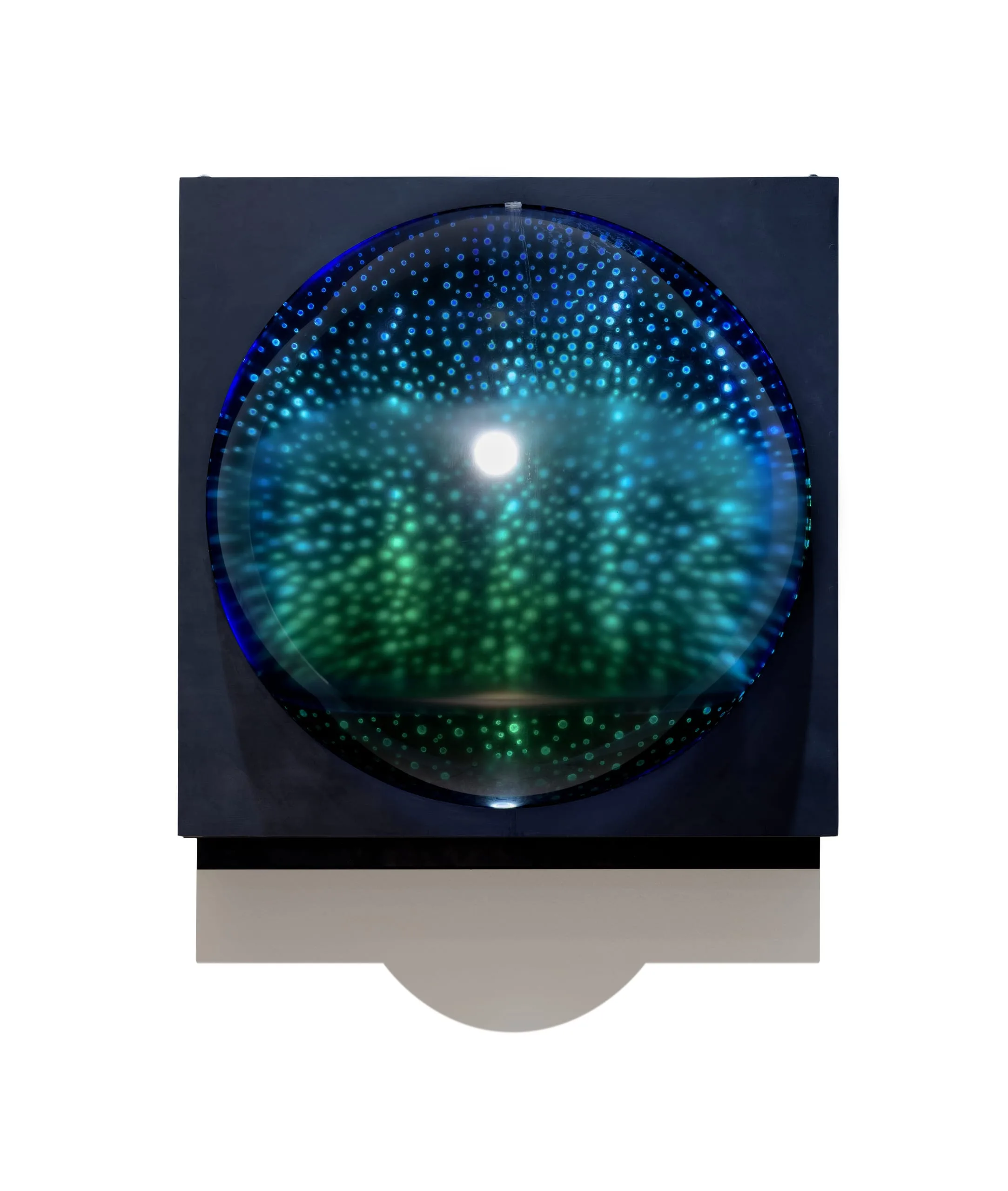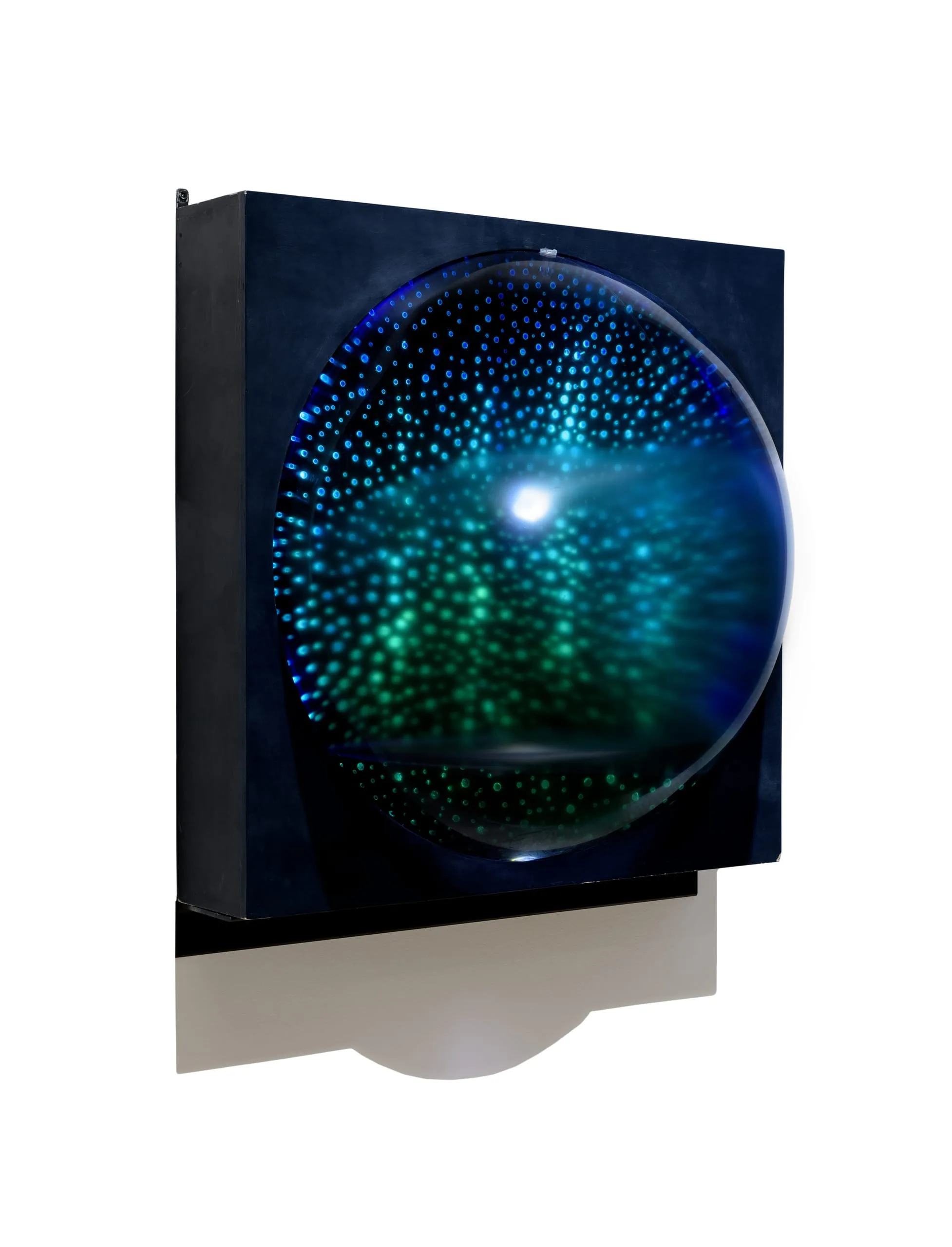 Hidroactivity is an excellent example of Kosice’s ruminations on utopianism and the aesthetic value of water. The box includes a hemispherical plastic container in which water is constantly recycled, placed against a dark panel peppered with glowing green lights that recalls outer space. While the acrylic encasement imposes order on water, air activates the piece into poetic motion. The static object transforms into an incessantly moving and changing structure, creating a unique experience for each viewer. Kosice envisioned that the “architecturalization” of water had greater sociological implications, invoking the utopian ideal that architecture and urbanism can be developed in all spaces and dimensions. Water, as a key element and vector of energy, could also be used as a force of aesthetic transmission. Though his radical proposals read more like poetic science fiction, they are indicative of his overall interest in creating a better human ecology. “When you talk about artists,” said Kosice, “you’re talking about people who are trying to be ahead of their time, forerunners of something. If this isn’t the creator’s role, then who else is going to have the vision make sense of things that are still unknown.”