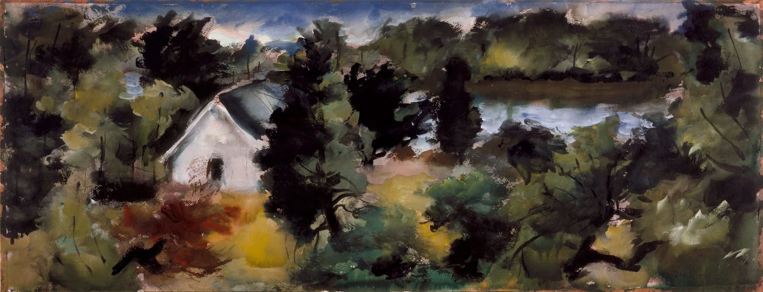 The subject matter of Green Trees and Blue Lagoon is of secondary importance, for Lutz was moving away from the specificity of time and place. He stated that this painting "marks the beginning of my dedication to the use of lush color and free brushwork." Anisfeld, his teacher in Chicago, had stressed the primary importance of color. In this painting the blues and greens are spirited and, although based on reality, assume an expressionist, nonreferential dimension. With an almost opaque medium, Lutz dashed the pigment onto the paper with short, swirling movements. The calligraphic touch enhances the soft quality of the foliage and atmosphere enveloping the trees. The brushwork and landscape subject, combined with the extremely horizontal format, are reminiscent of oriental screens.