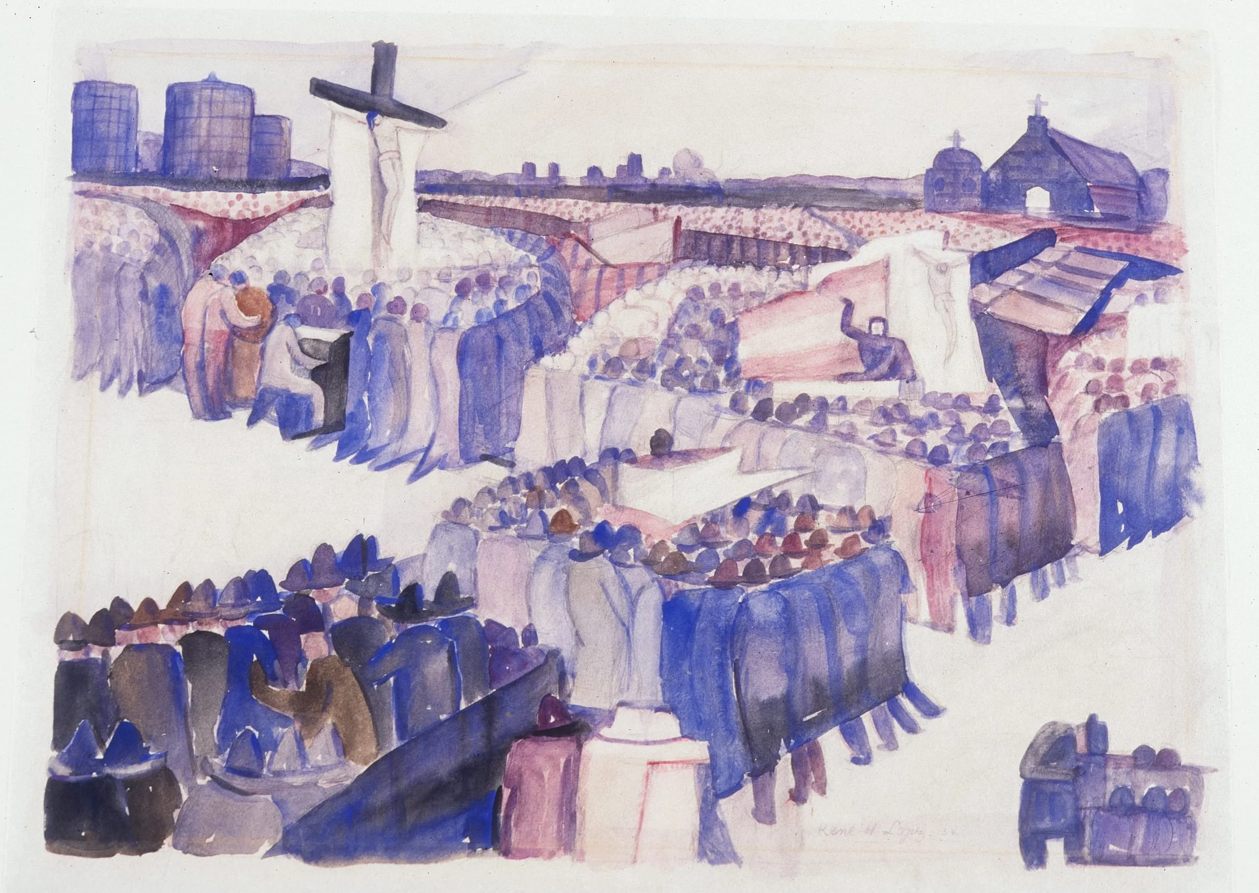 Lopez often painted city views with masses of figures. In this delicately tinted watercolor hundreds of people are gathered in a city plaza, perhaps for a religious festival. The large expanse of open land and distant oil tanks suggest that the event is taking place in a large industrial center, perhaps Los Angeles. Completed only a few years after Lopez was a student, the watercolor is quite sophisticated, displaying an assured control of the fluid medium and a mastery of abstract shapes. The cool hues dominating the scene suggest a cold, wintry day. Lopez employed a similar blue tonality for his New York cityscapes.