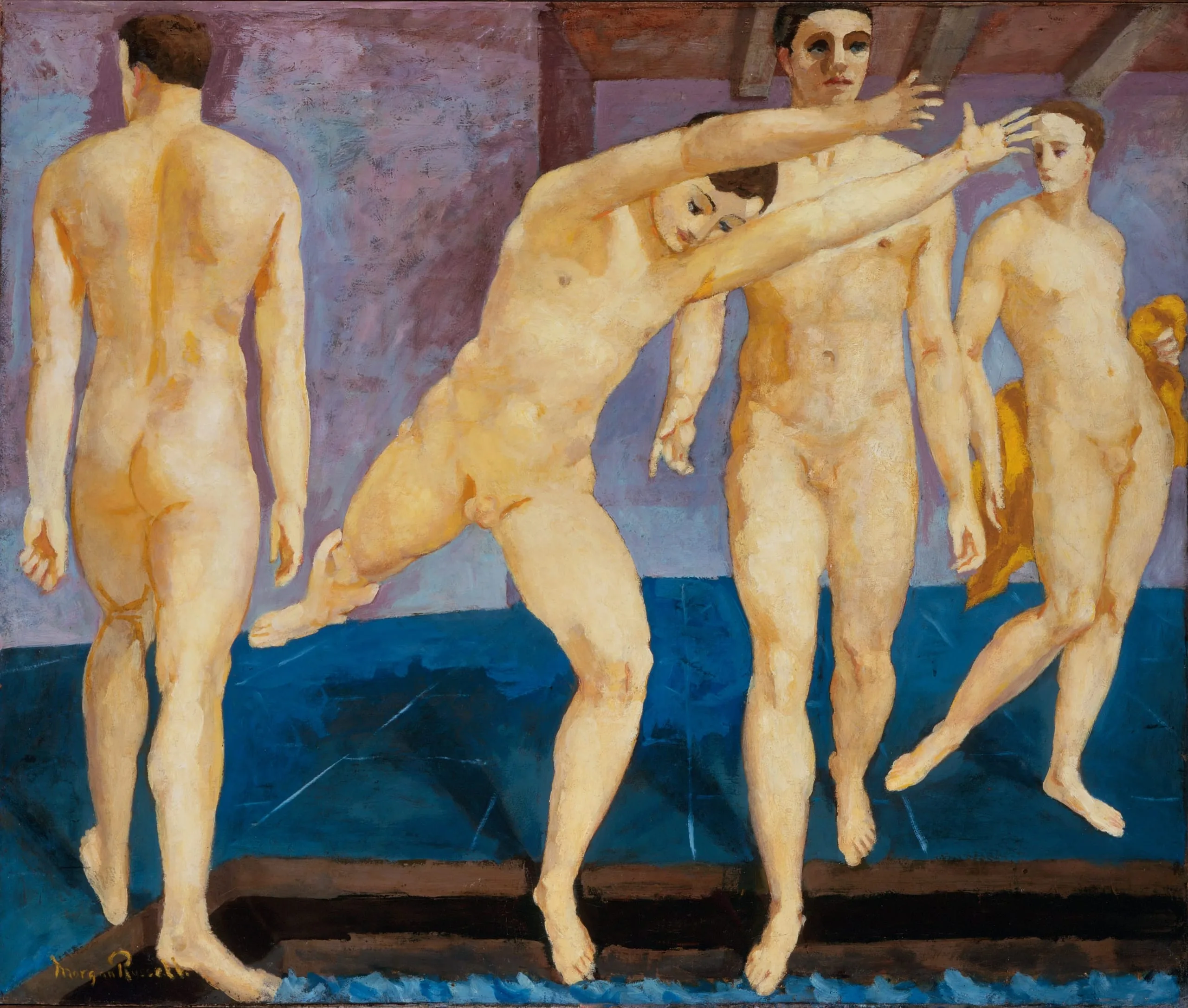 Many of Russell’s later canvases were of male nudes, and he considered these figure paintings to be his most significant work after the synchromies. Sometimes the nudes were depicted in a mythological guise but often they were bathers, as in Piscine. Russell was preoccupied with the heroic form of the human figure from his earliest days as an artist, when, inspired by Michelangelo, he sculpted a nude male; even the synchromies were based on the movement of the human form. In his late paintings Russell stressed the solidity of the nude’s body as would a sculptor.