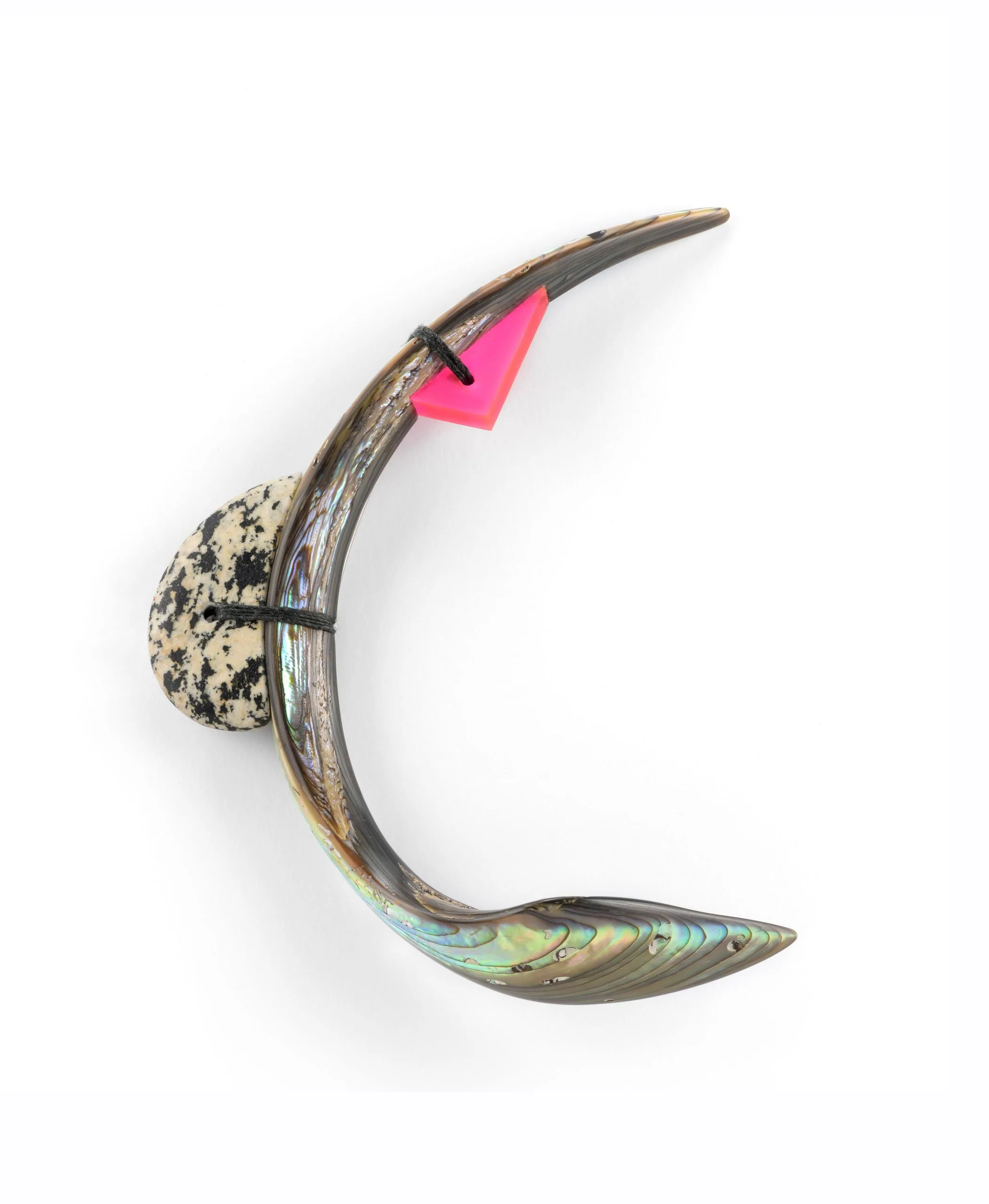 - Pāua shell, pebble, polymethyl methacrylate, fiber