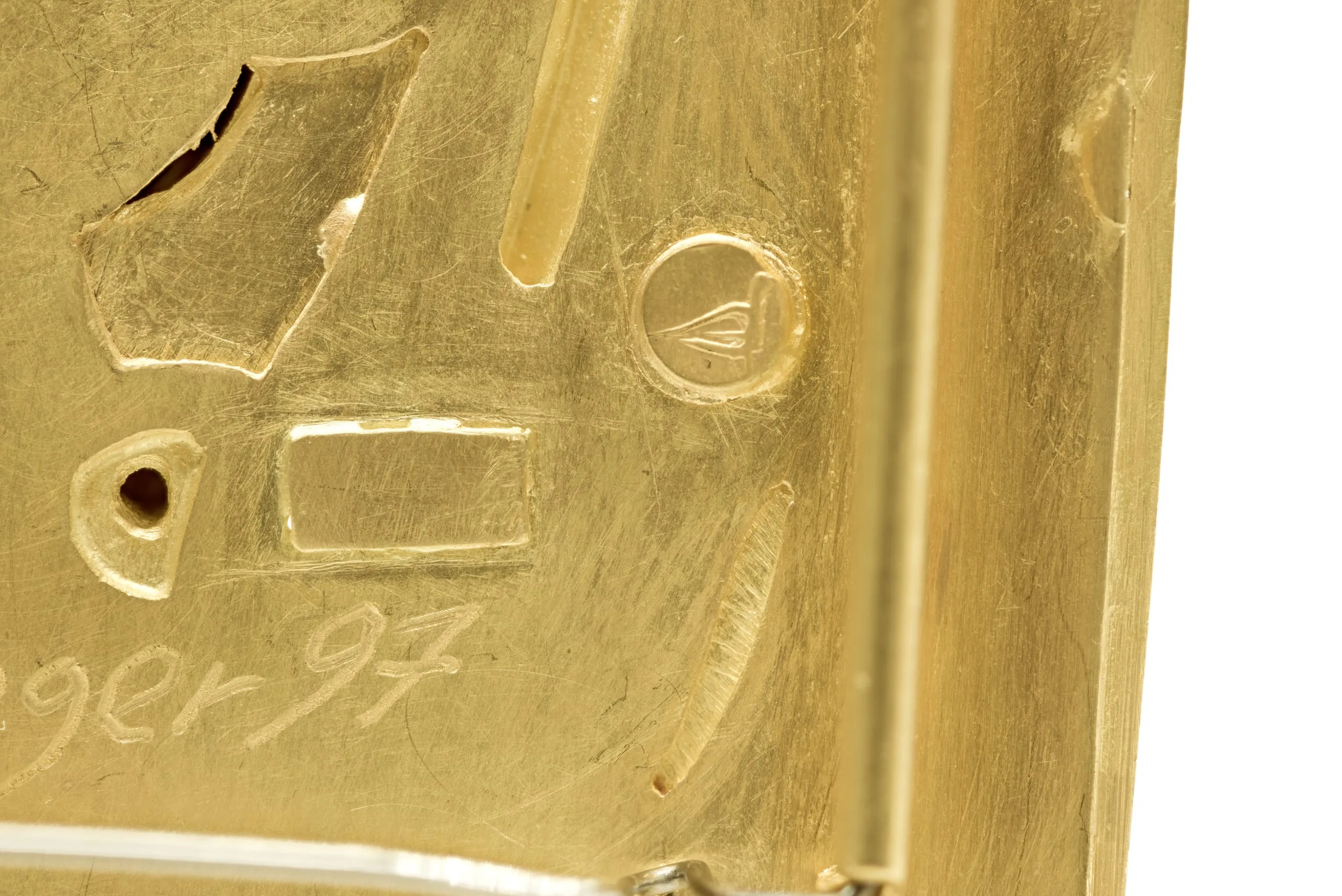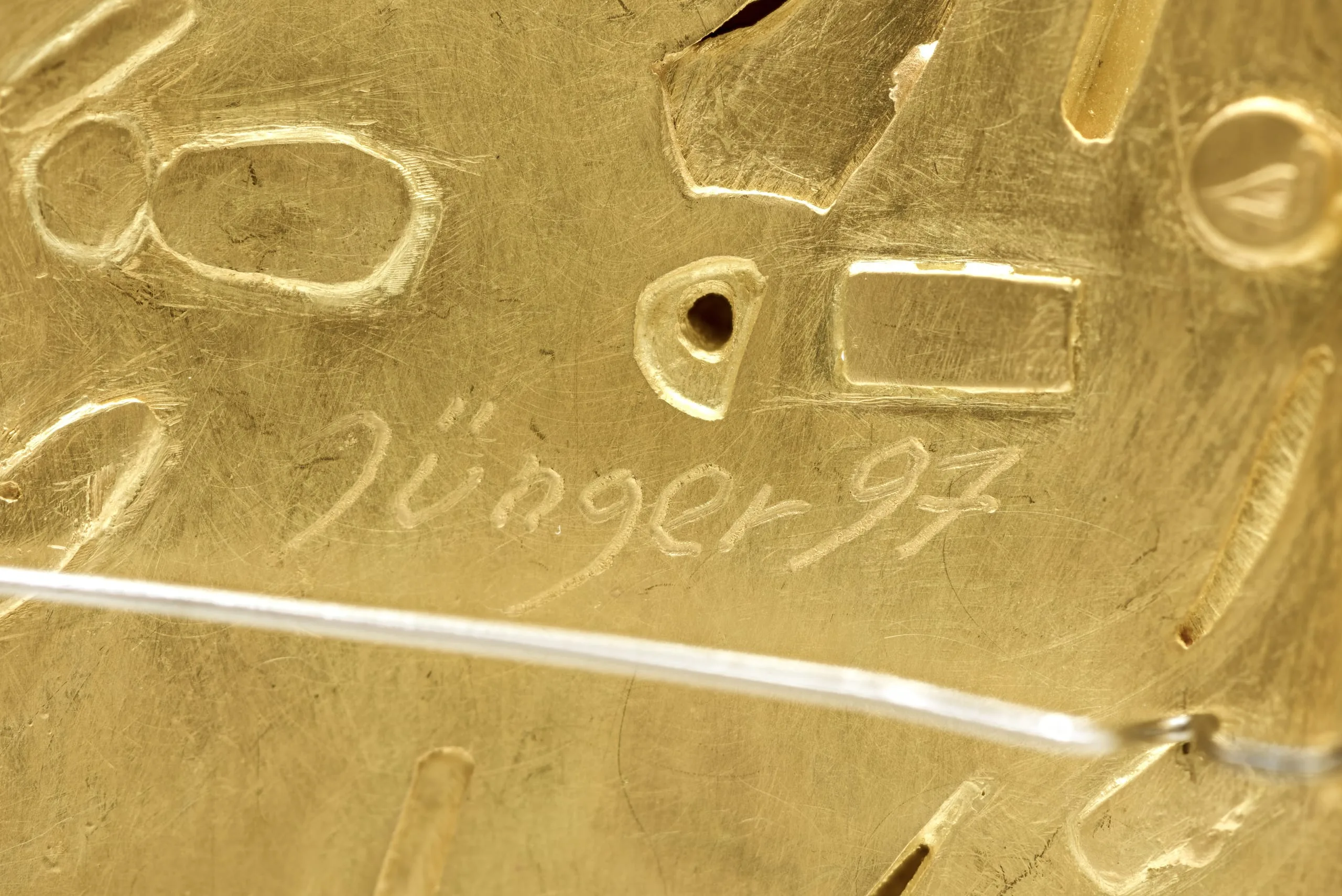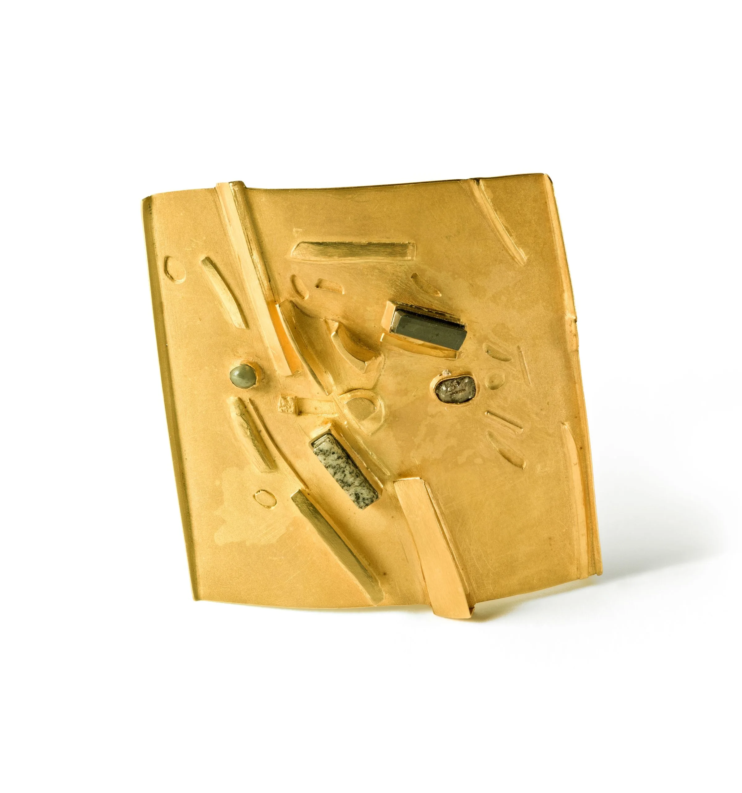 - Gold, semiprecious stones, possibly resin