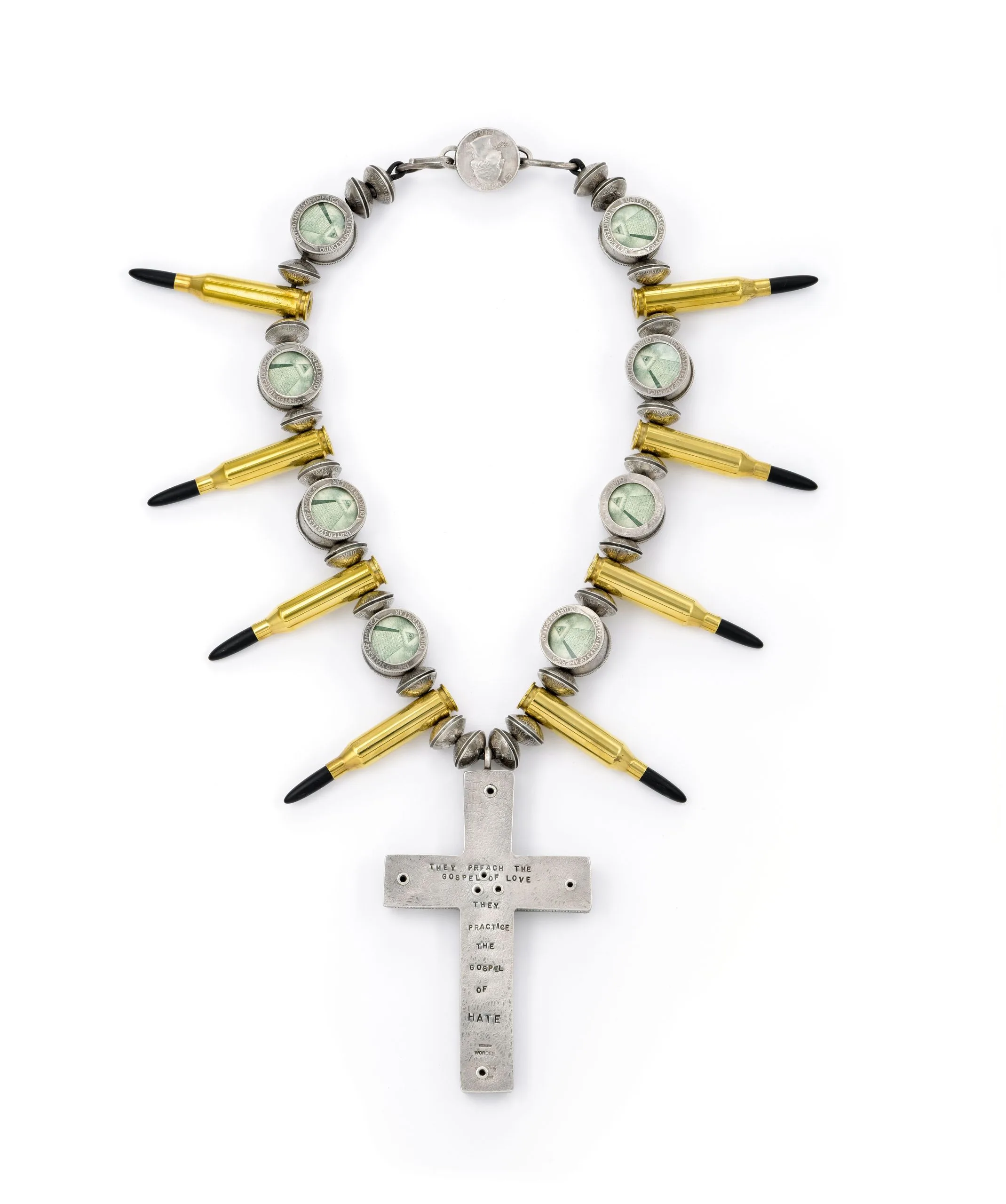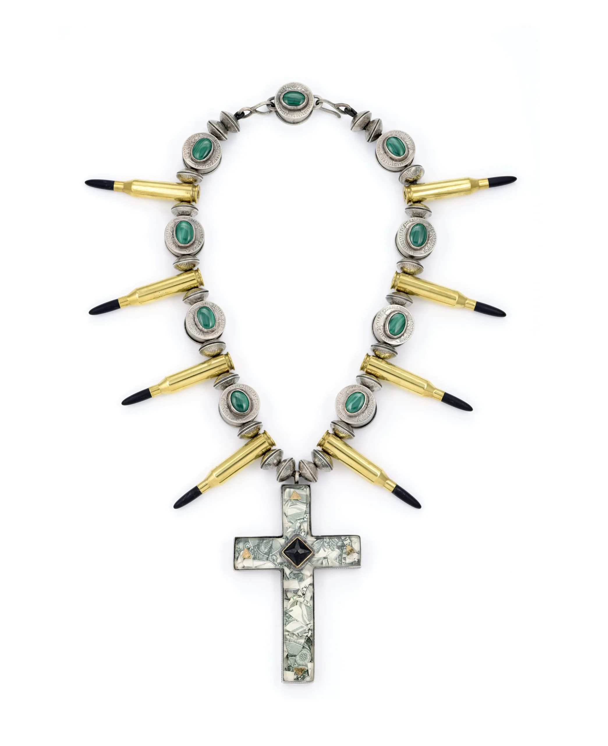 - US currency, brass rifle shells, onyx, malachite, silver, acrylic, gold