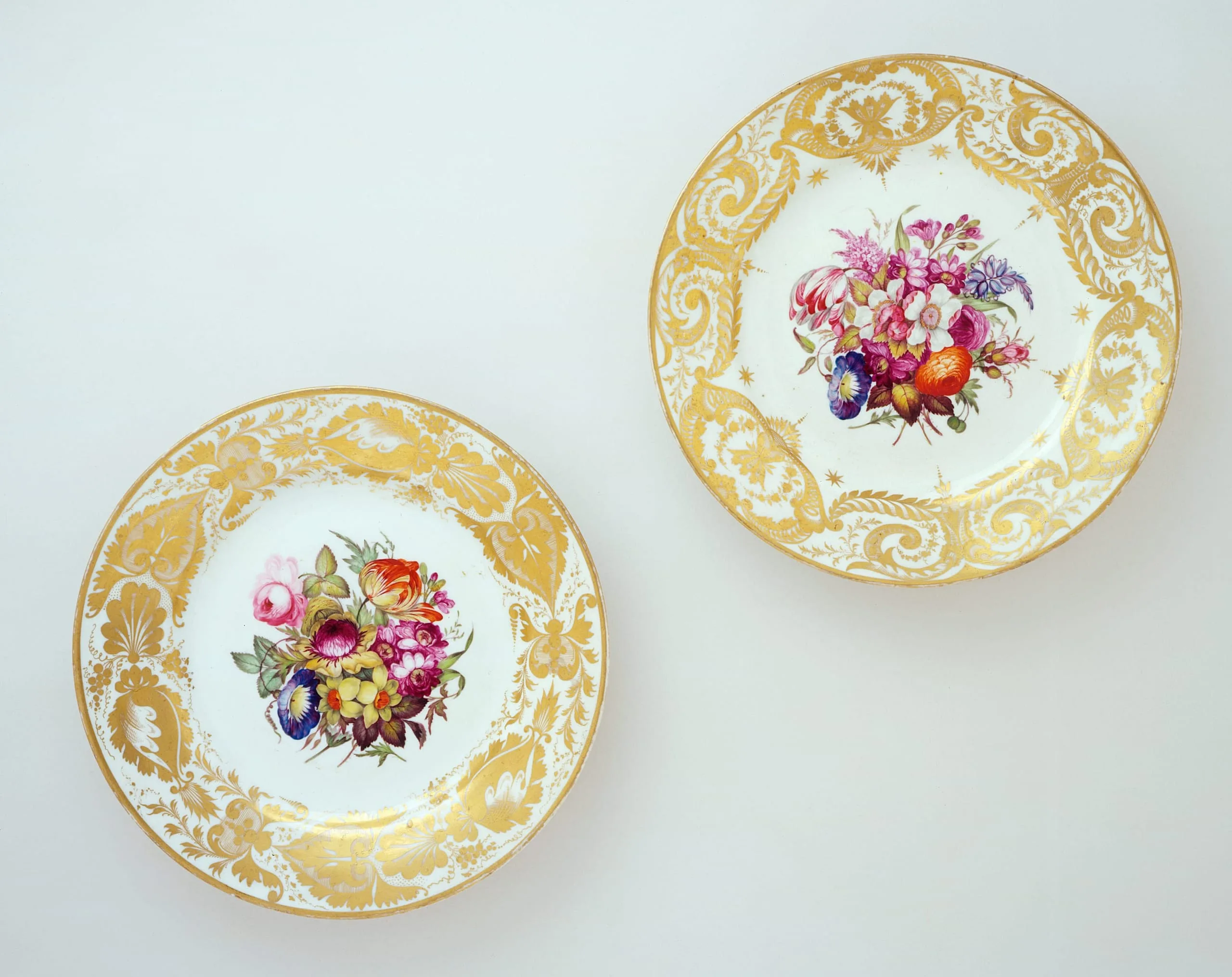 Two porcelain plates with wide honey-gold gilded borders of scrolling acanthus and lace patterns, each centered with a painted bouquet of colorful flowers including roses, tulips, and irises
