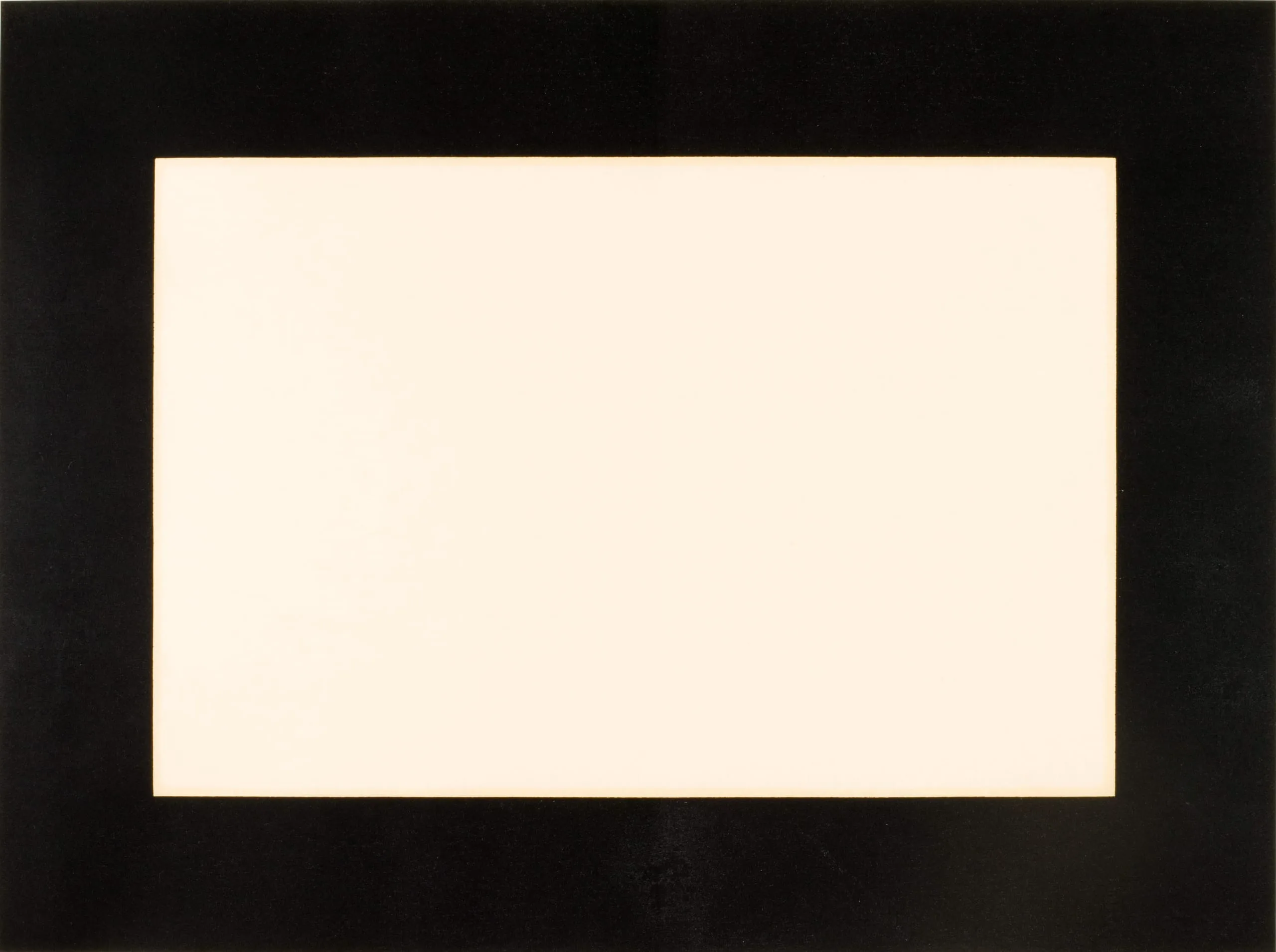 Horizontal abstract painting with a large cream-colored rectangle centered within a flat, near-black border, hard-edged with no visible brushwork
