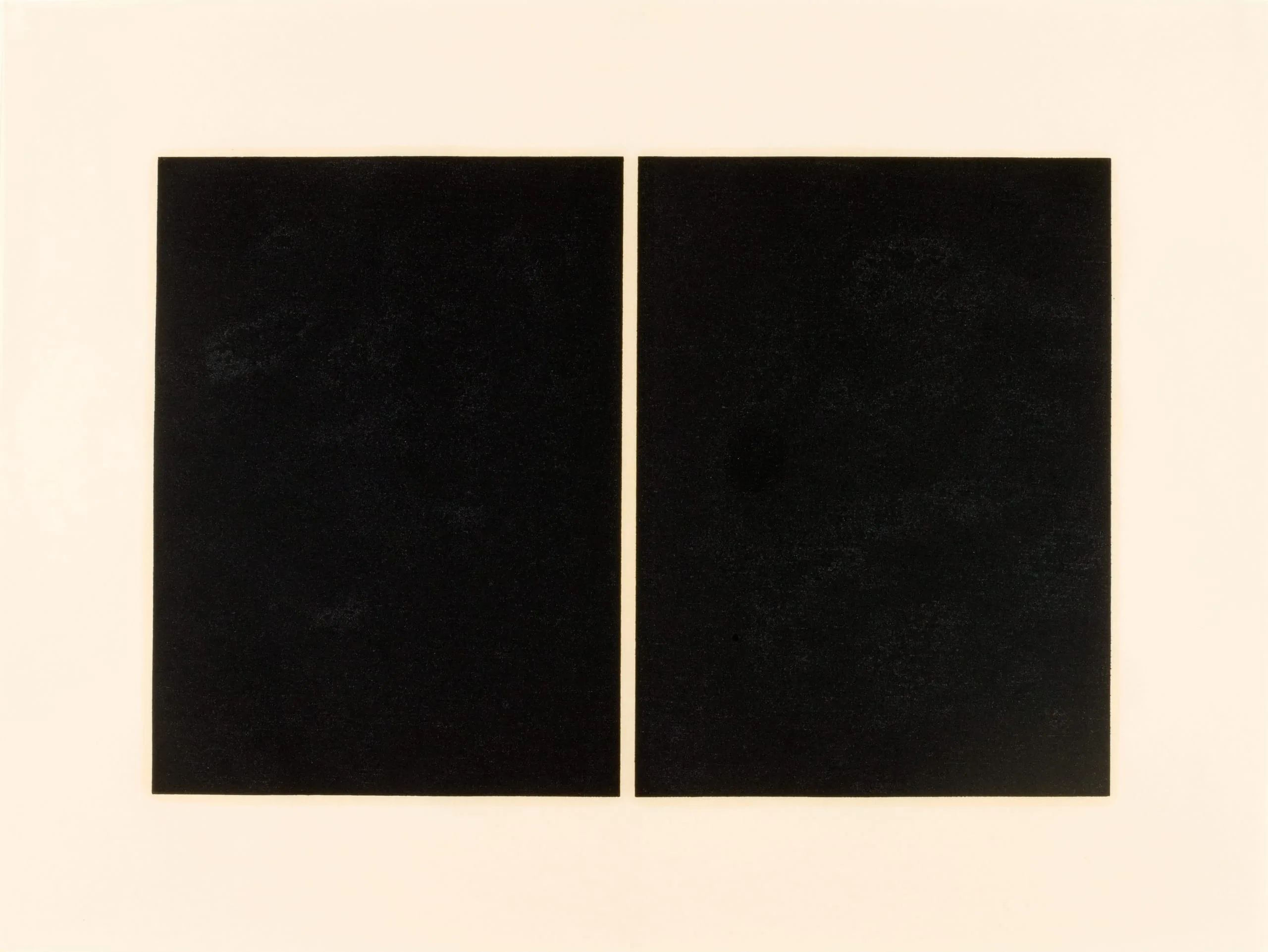 Abstract work with two large side-by-side black rectangles on a cream ground, separated by a narrow vertical gap, with subtle tonal variation across the matte surfaces
