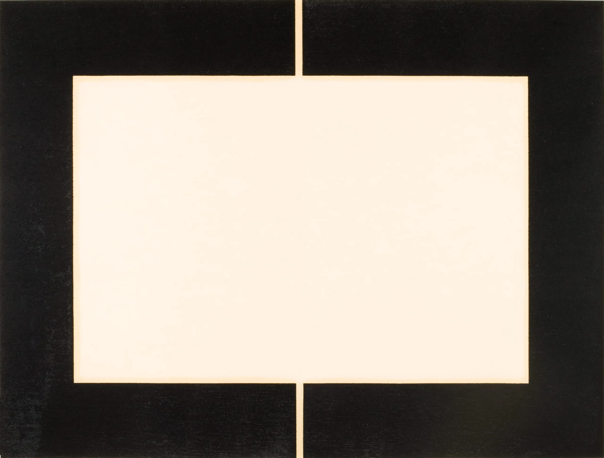 Abstract painting with a large cream-white rectangle centered on a flat black field, bisected by a narrow vertical cream line running from the top edge