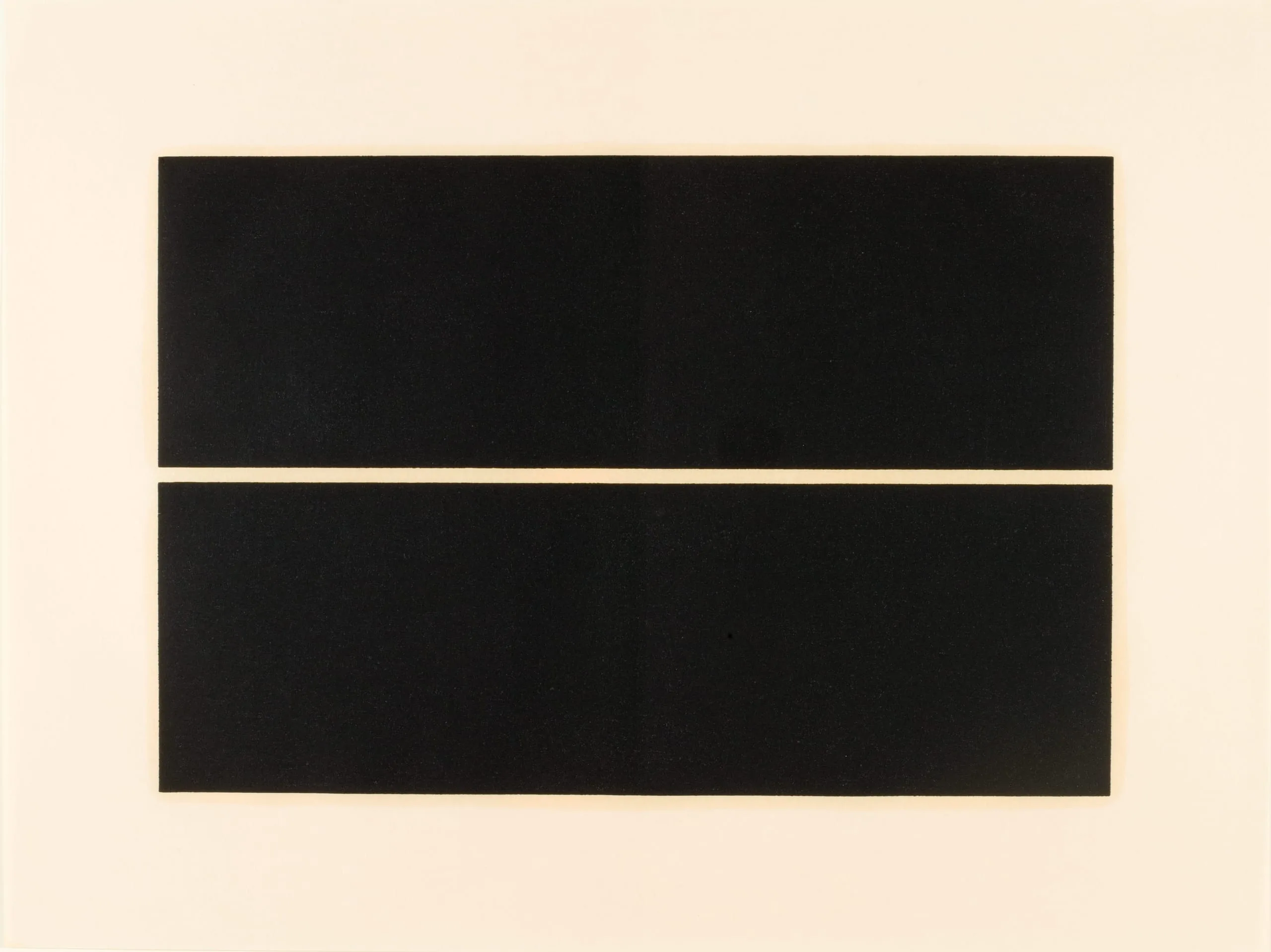 Abstract horizontal composition with two large, flat black rectangles stacked vertically, separated by a narrow cream-colored gap, on a cream ground