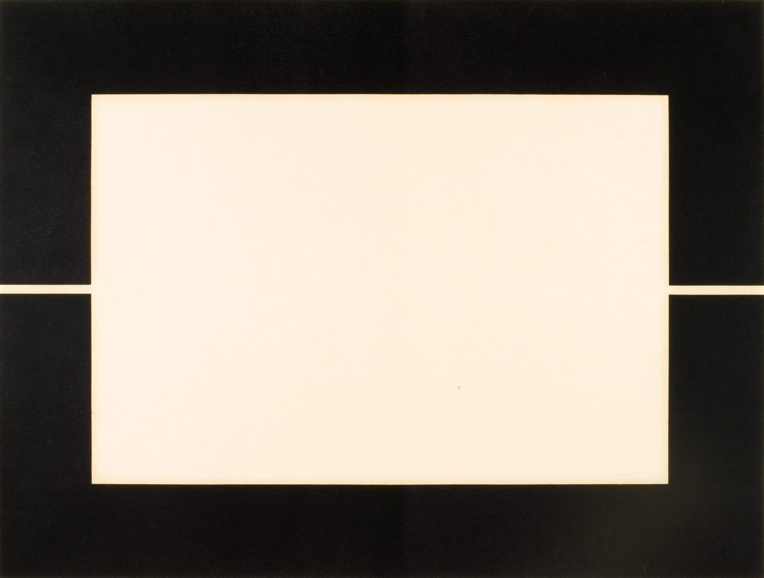 Abstract painting with a large cream-colored rectangle centered on a near-black ground, bisected by a thin horizontal white line extending edge to edge