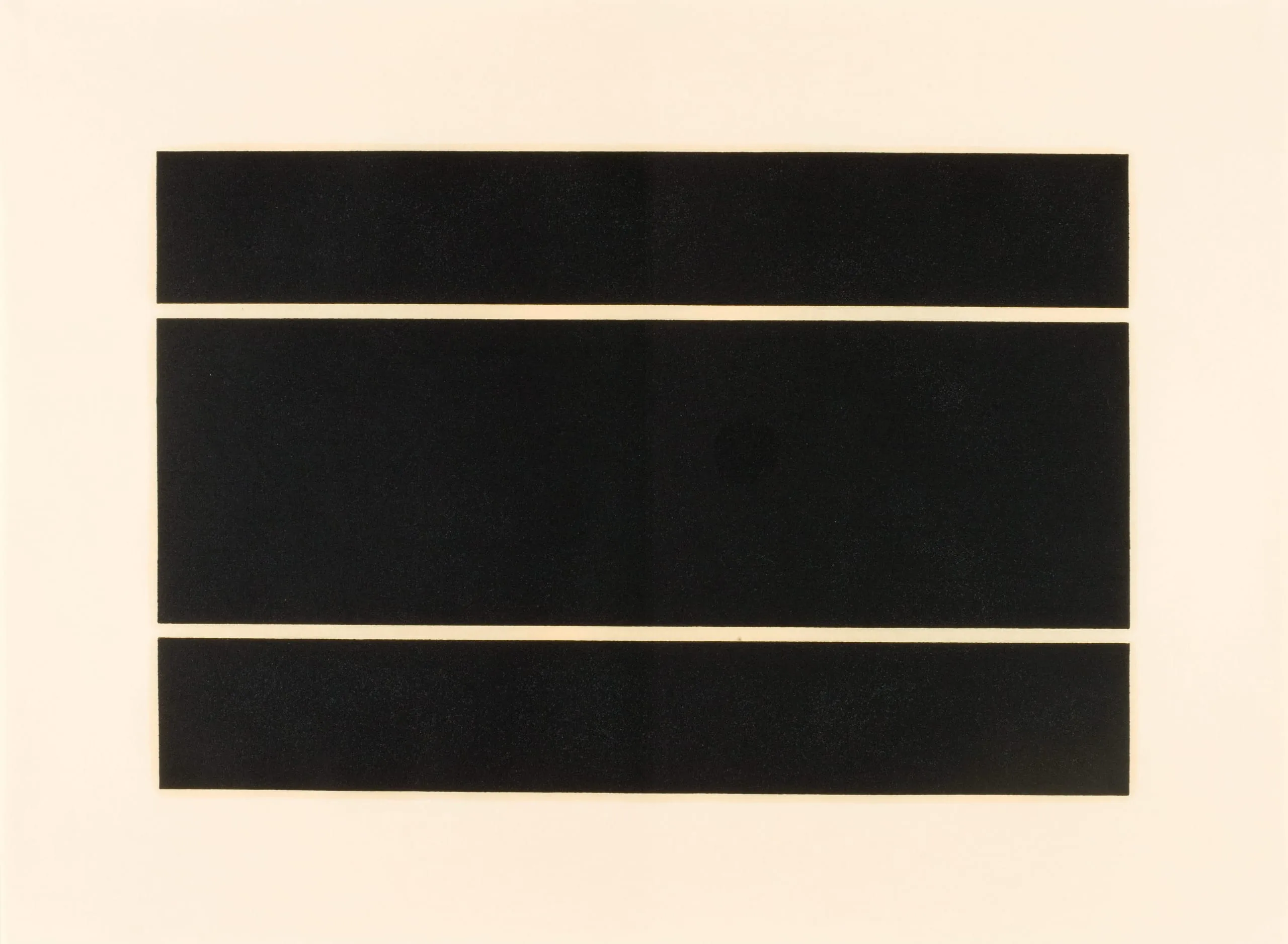 Abstract horizontal print with three flat black rectangles stacked evenly on a cream ground, separated by thin horizontal gaps