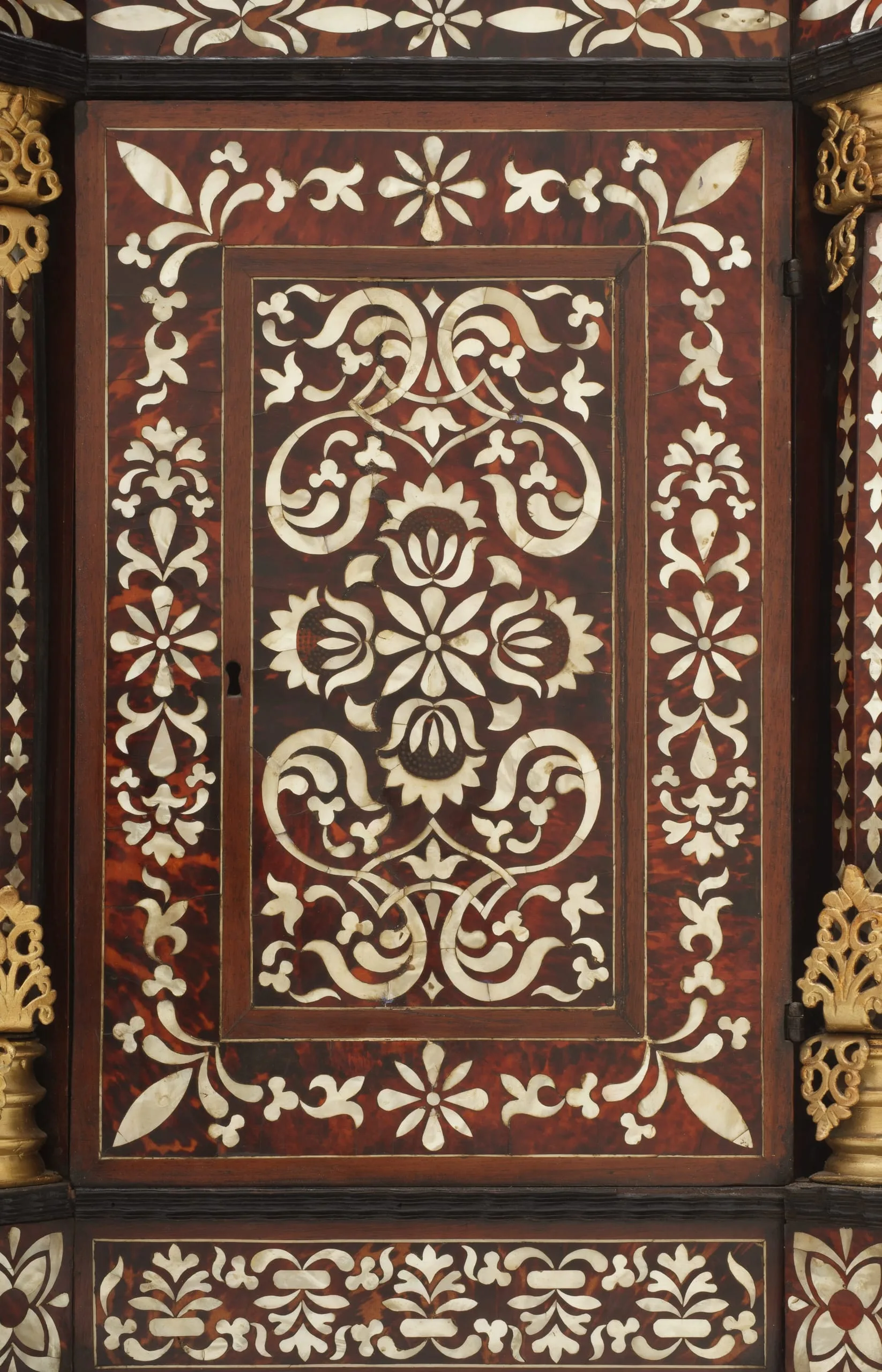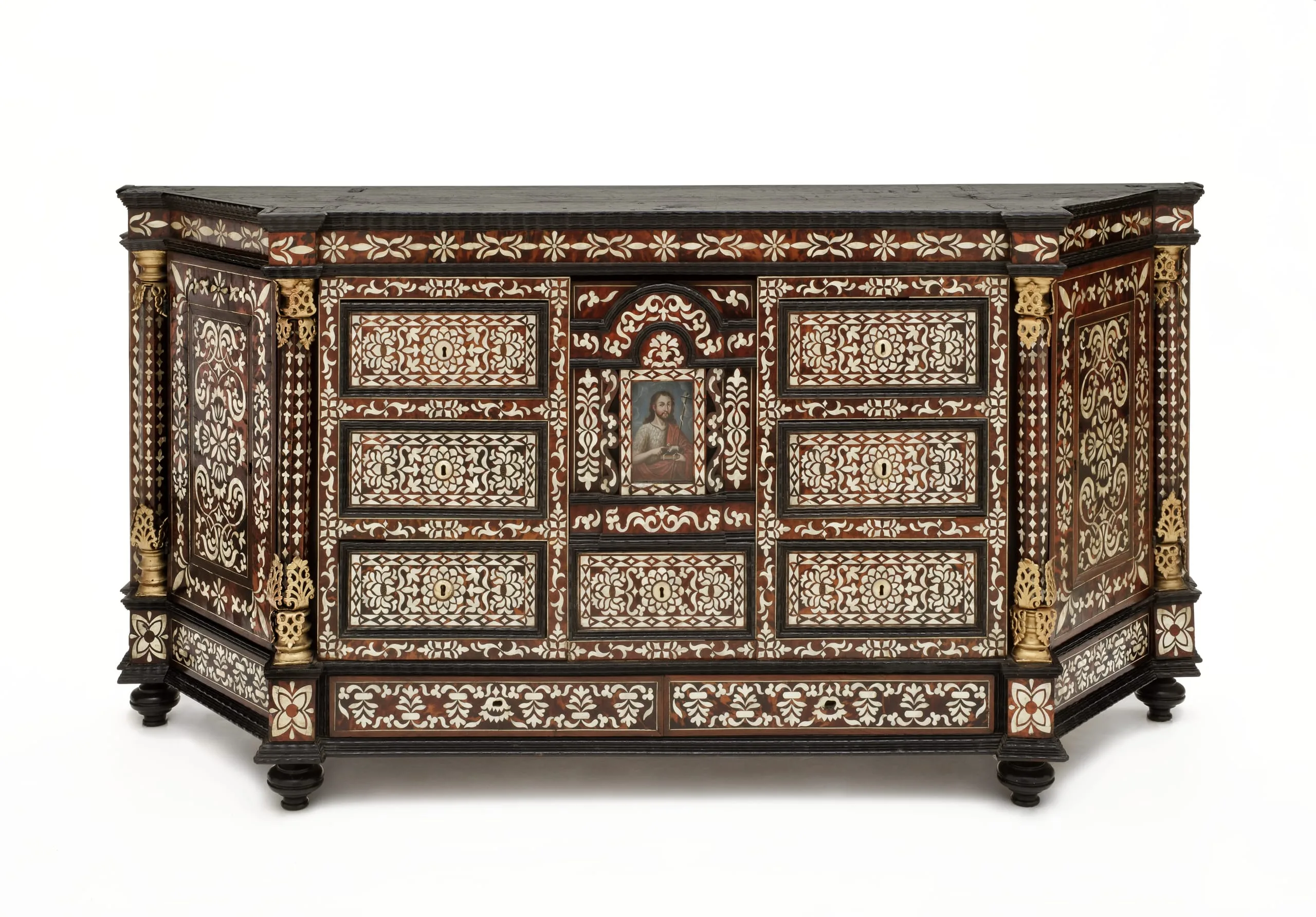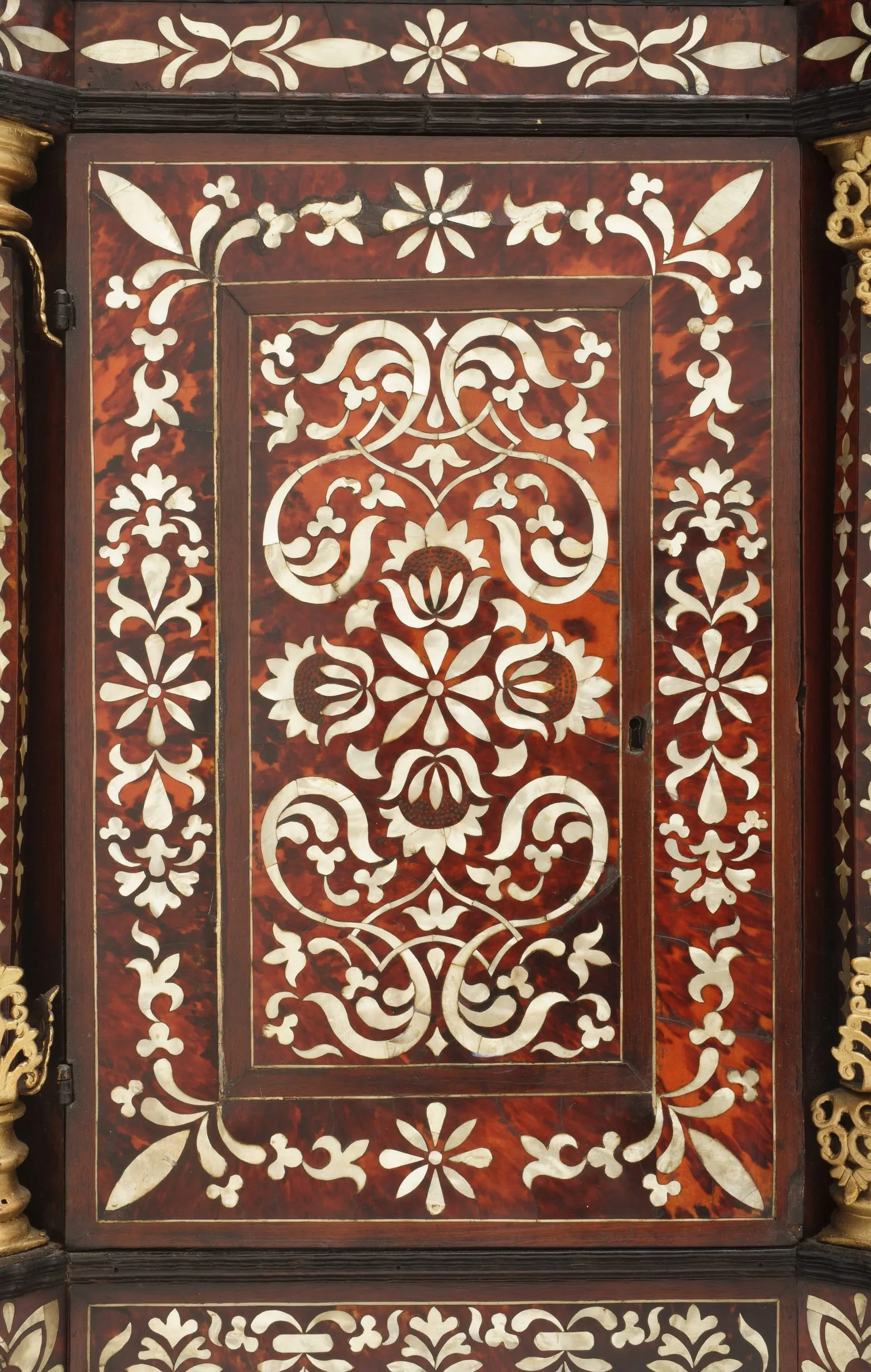 Spanish American furnishings veneered in tortoiseshell and mother-of-pearl designs are known as enconchados. The term derives from the application of small sheets of mother-of-pearl (concha de perla) on wooden surfaces. Because of their materials and decorative schemes, the works have been slippery to categorize. Scholars have suggested that they were imported aboard the famous Manila Galleons that traveled annually to the port of Acapulco in Mexico, from where the objects were distributed throughout Spanish America. Some experts have argued that their profusion in Lima suggests local manufacture, possibly with the involvement of Asian artisans. Archival and material documentation, however, seems to suggests that the works originated in Guatemala City, where mother-of-pearl and tortoiseshell were harvested locally and considered a prized commodity. Many works made of these materials were exported to Mexico and Peru. The designs draw on a range of European and Asian sources, which local artists creatively reinterpreted.