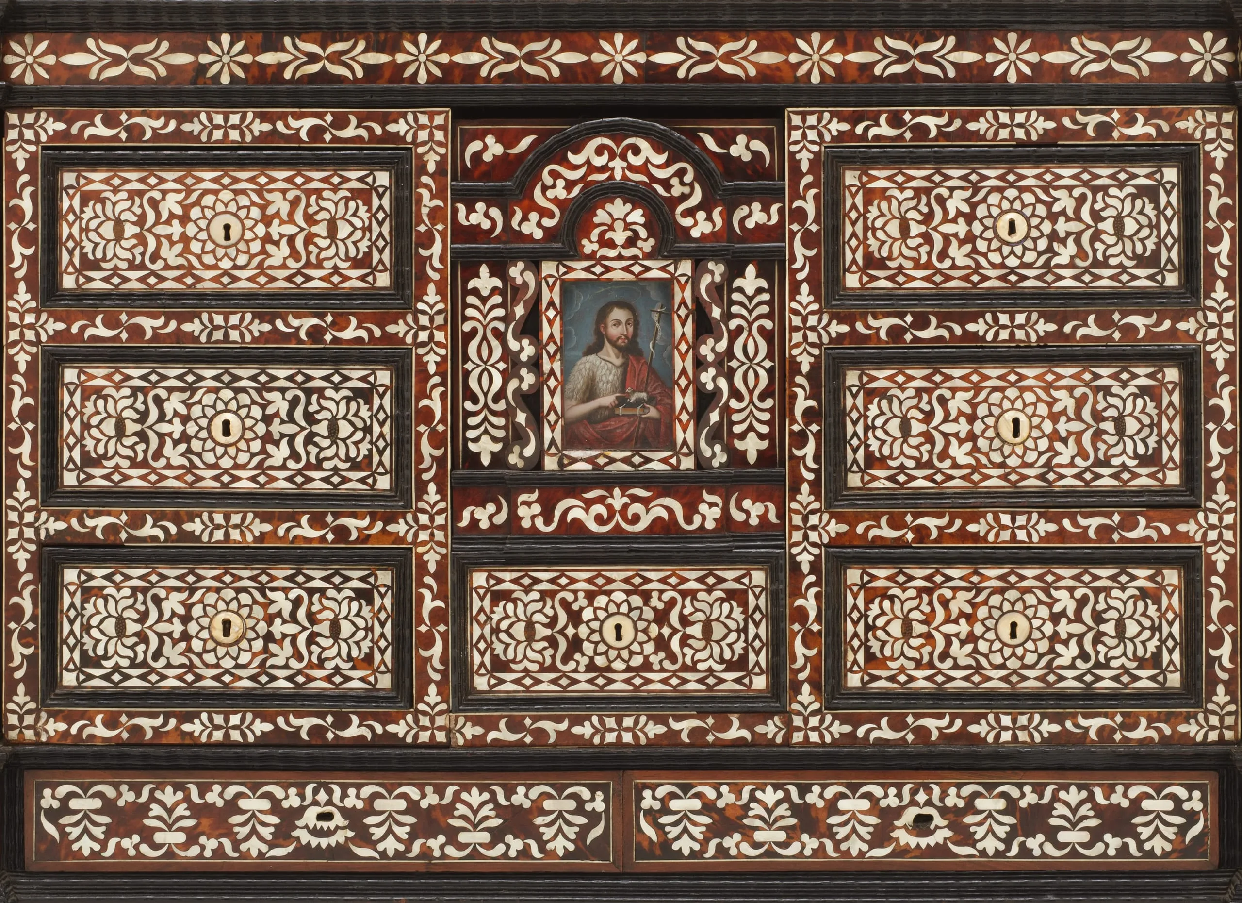 The cabinet would have been displayed on a matching bufete (stand) with a second bureau stacked on top, forming a pyramidal ensemble. Modeled after seventeenth-century German, Flemish, and Iberian prototypes, the works were usually crowned with a valuable object or sculpture. These “towers of riches” could also incorporate religious images under glass, asserting the piety of their owners. This example contains a central niche enlivened with a painting of Saint John the Baptist.