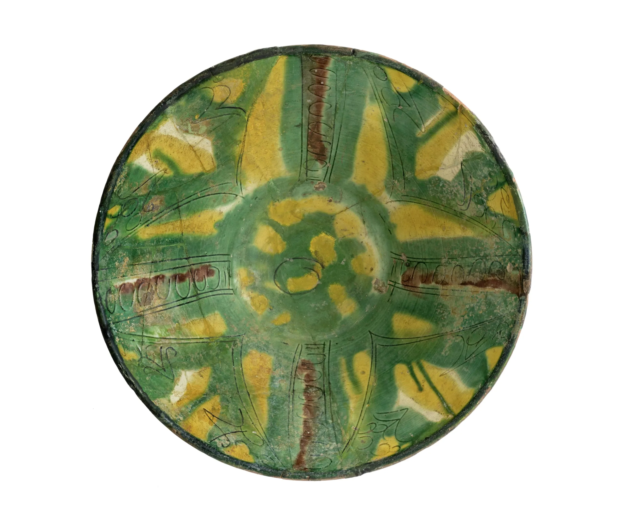 Ceramic bowl seen from above, shallow form with radiating green and amber yellow glaze in wedge-shaped zones, incised decoration, and small reddish-brown arch motifs in four quadrants