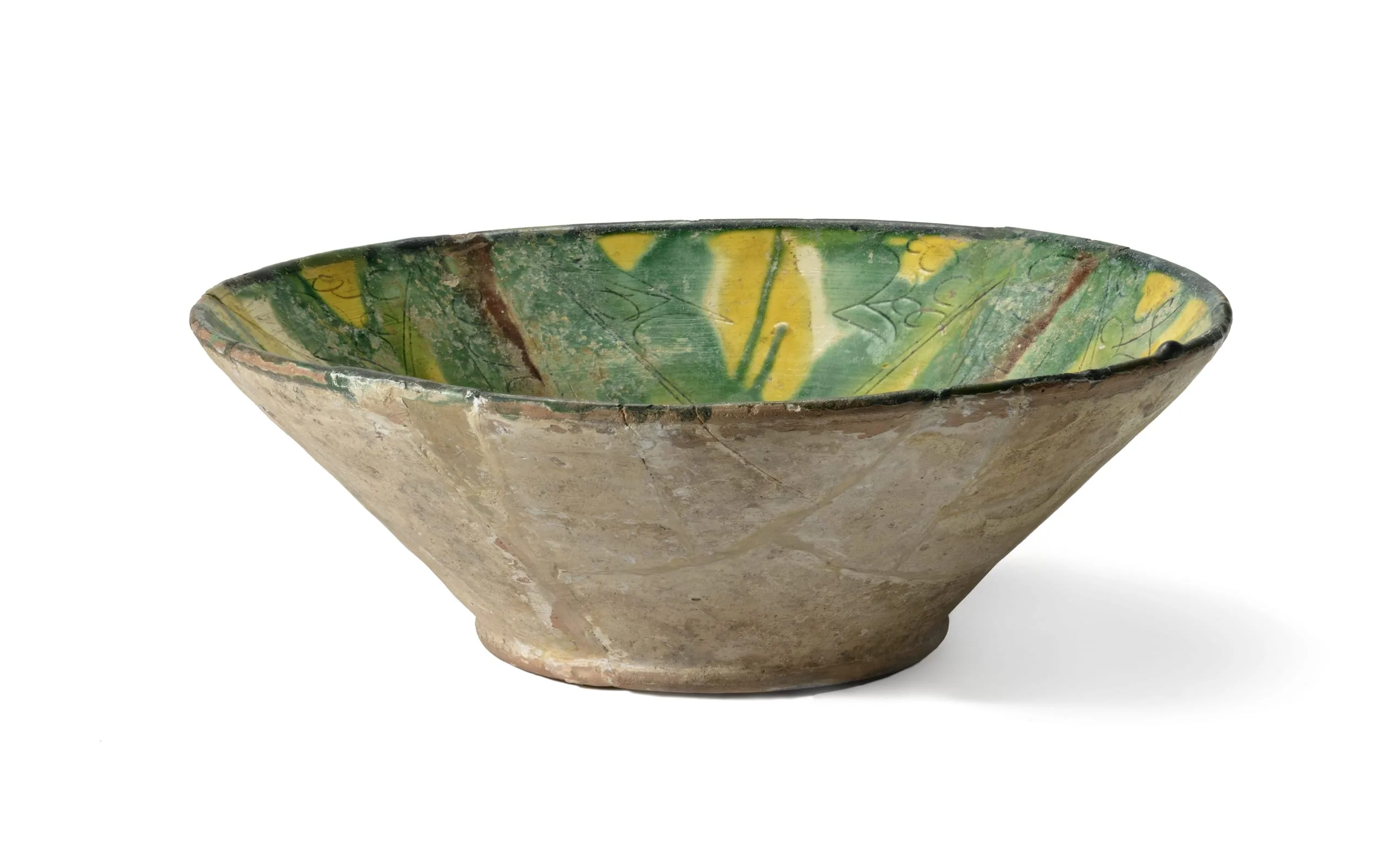 Ceramic bowl with wide conical form and flat foot ring; unglazed buff exterior with visible cracks; interior decorated with splashed green, yellow, and brown glazes in broad strokes.