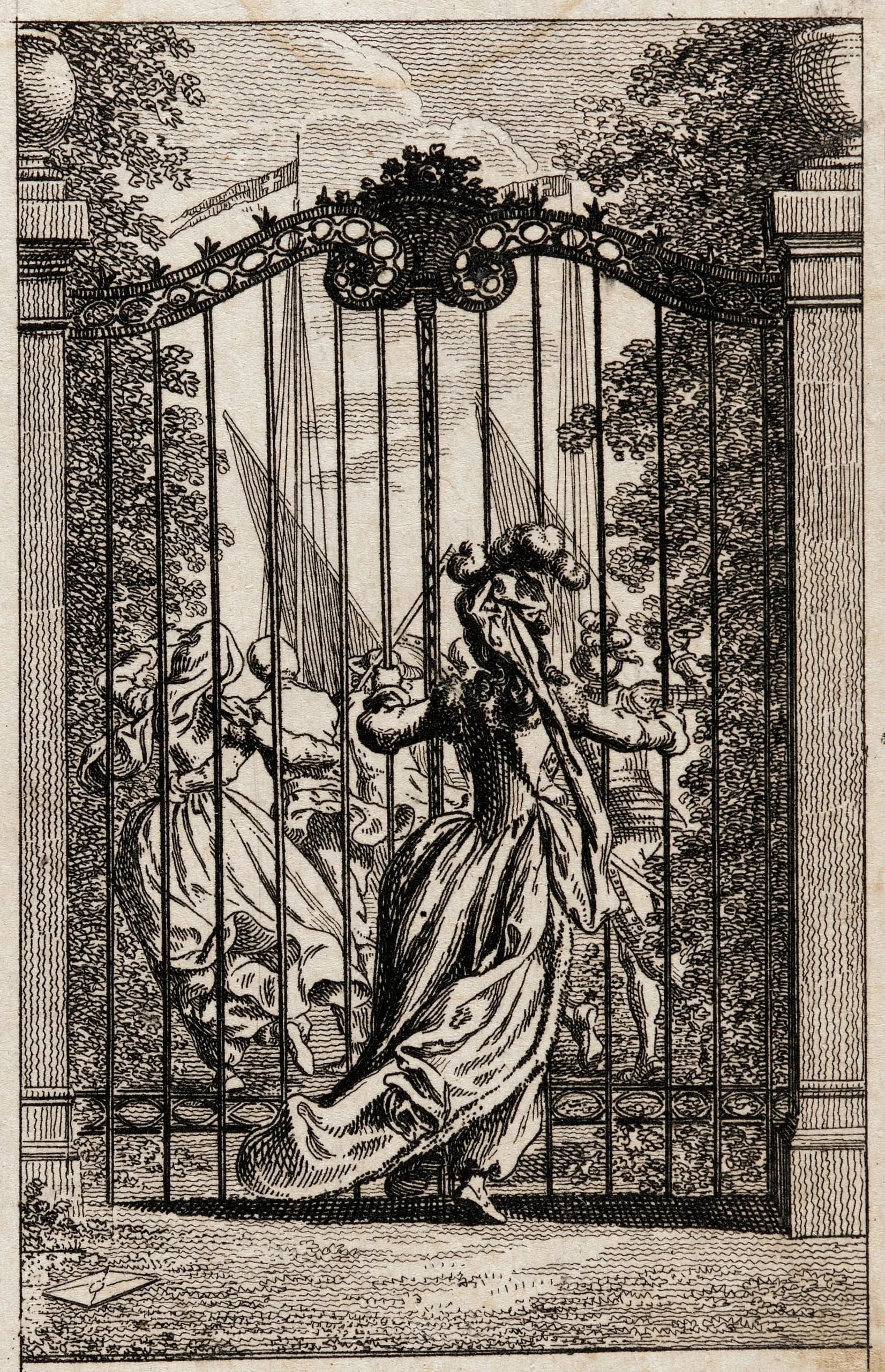 Engraving on cream paper of a woman in a full gown and feathered hat gripping the bars of an ornate iron gate, with a garden scene and figures visible beyond