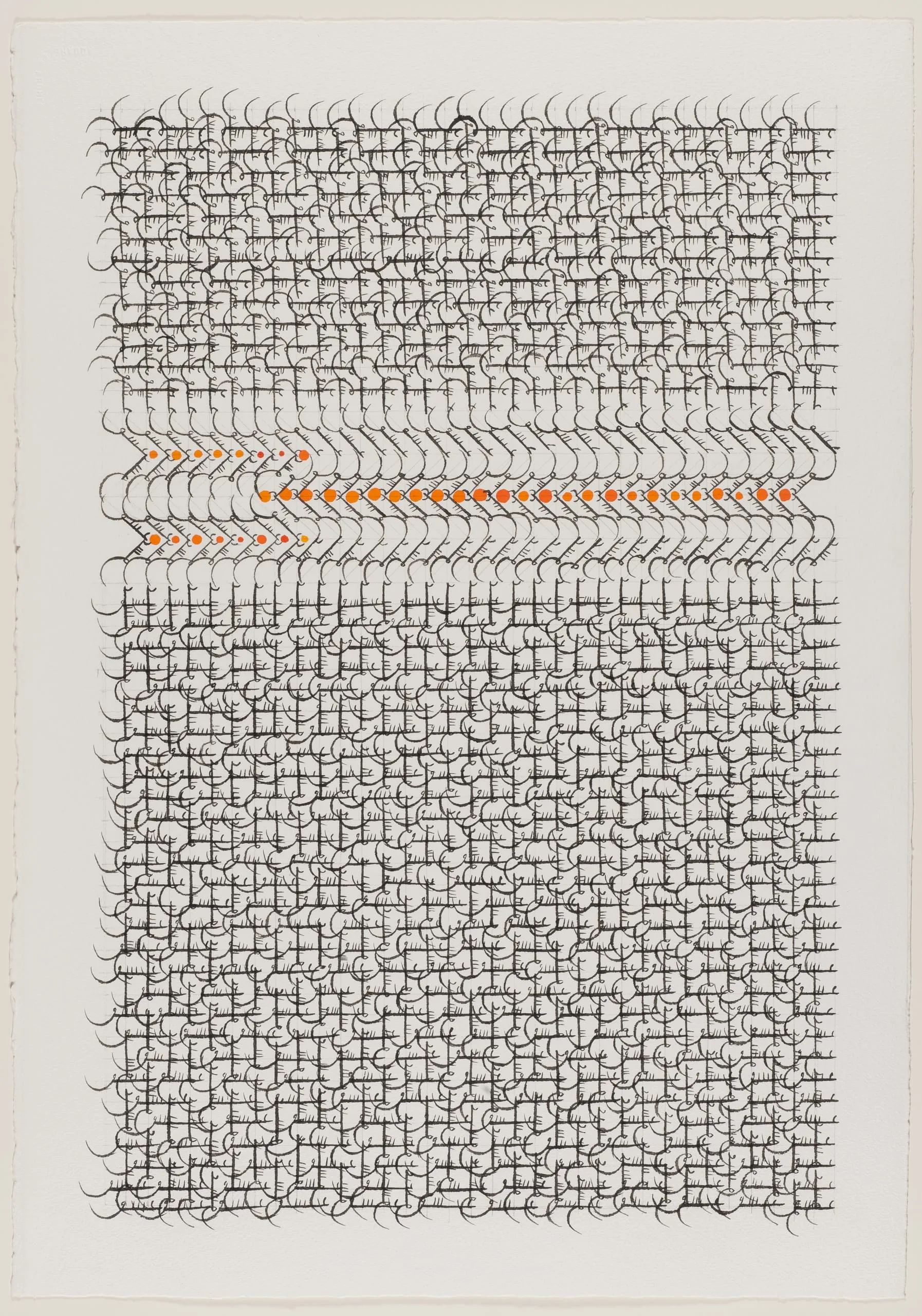 The abstract network of design that defines this composition was inspired by Islamic calligraphy, in particular a medieval Persian manuscript page. Although the contemporary work is on a vastly expanded scale, the black-marked band of design punctuated by orange dots is reminiscent of the illuminated headers that frame the titles of chapters and sections of the traditional manuscript, while the black marks above and below suggest the text. In fact, this is an actual text—the single Persian word ‘Eshq (love), in which the curvilinear letters overlap, intersect, and are hypnotically repeated to form an abstract, grid-like design.