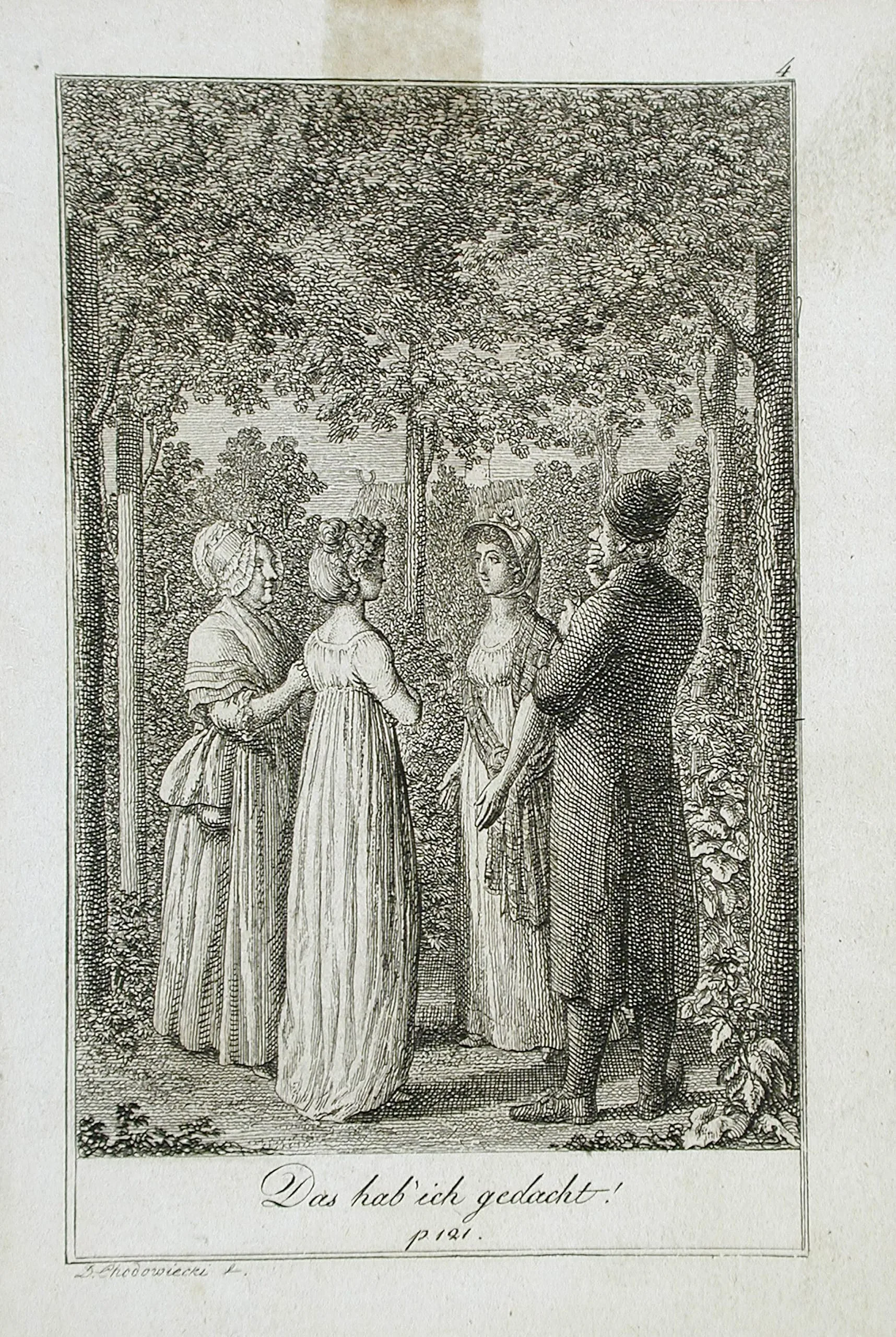 Engraving on cream paper, four figures in early 19th-century dress conversing among trees, with German script caption below