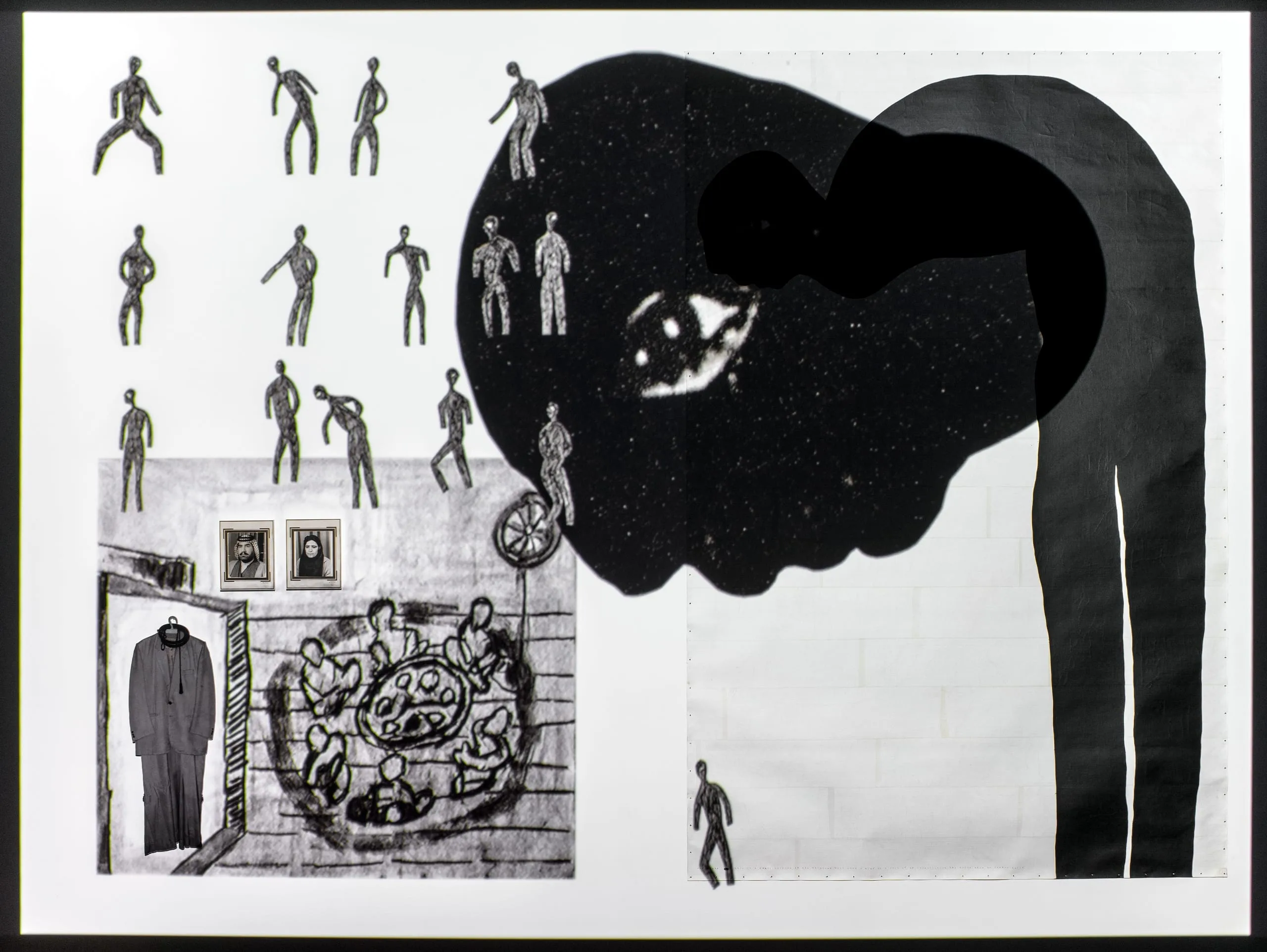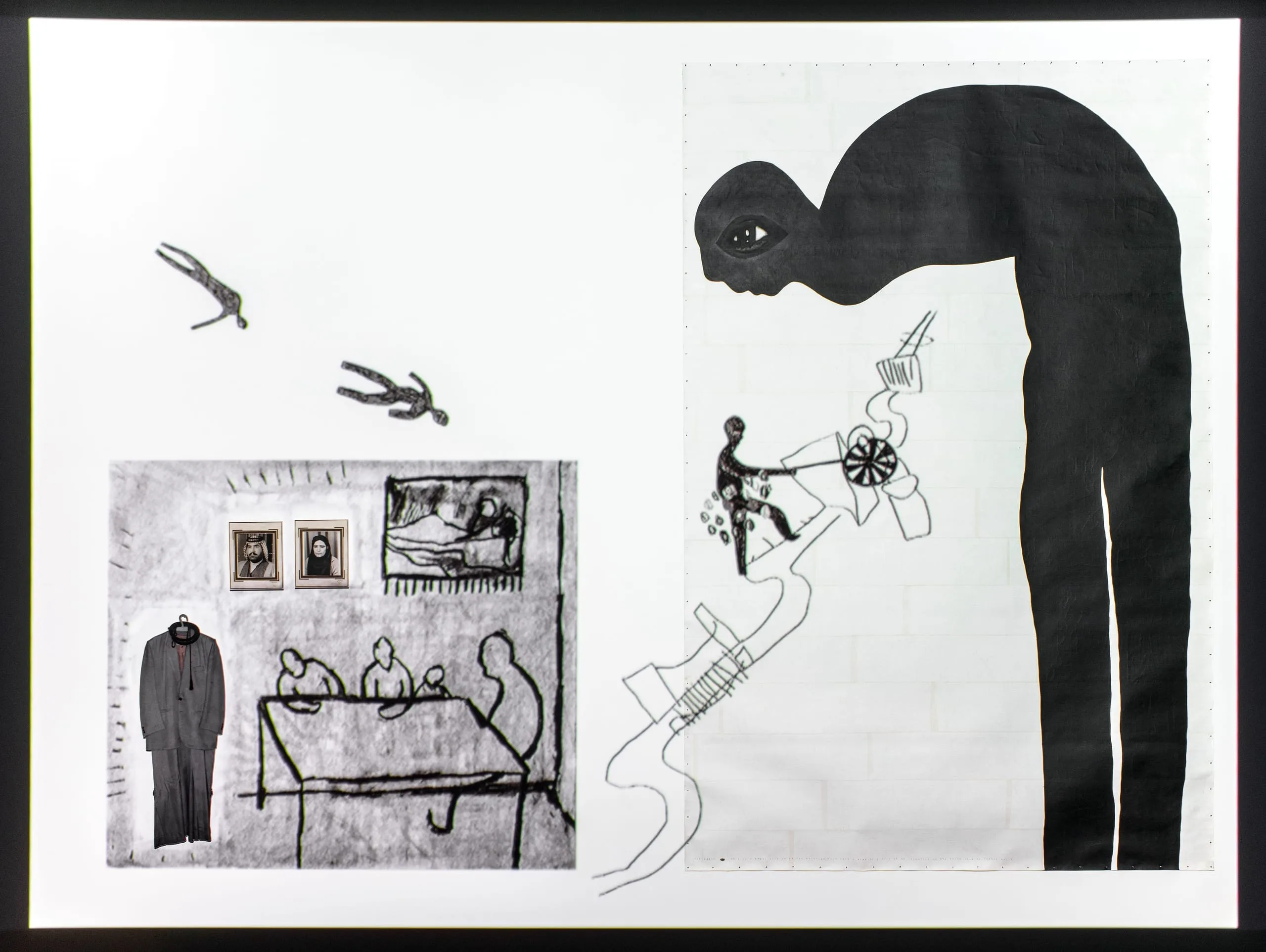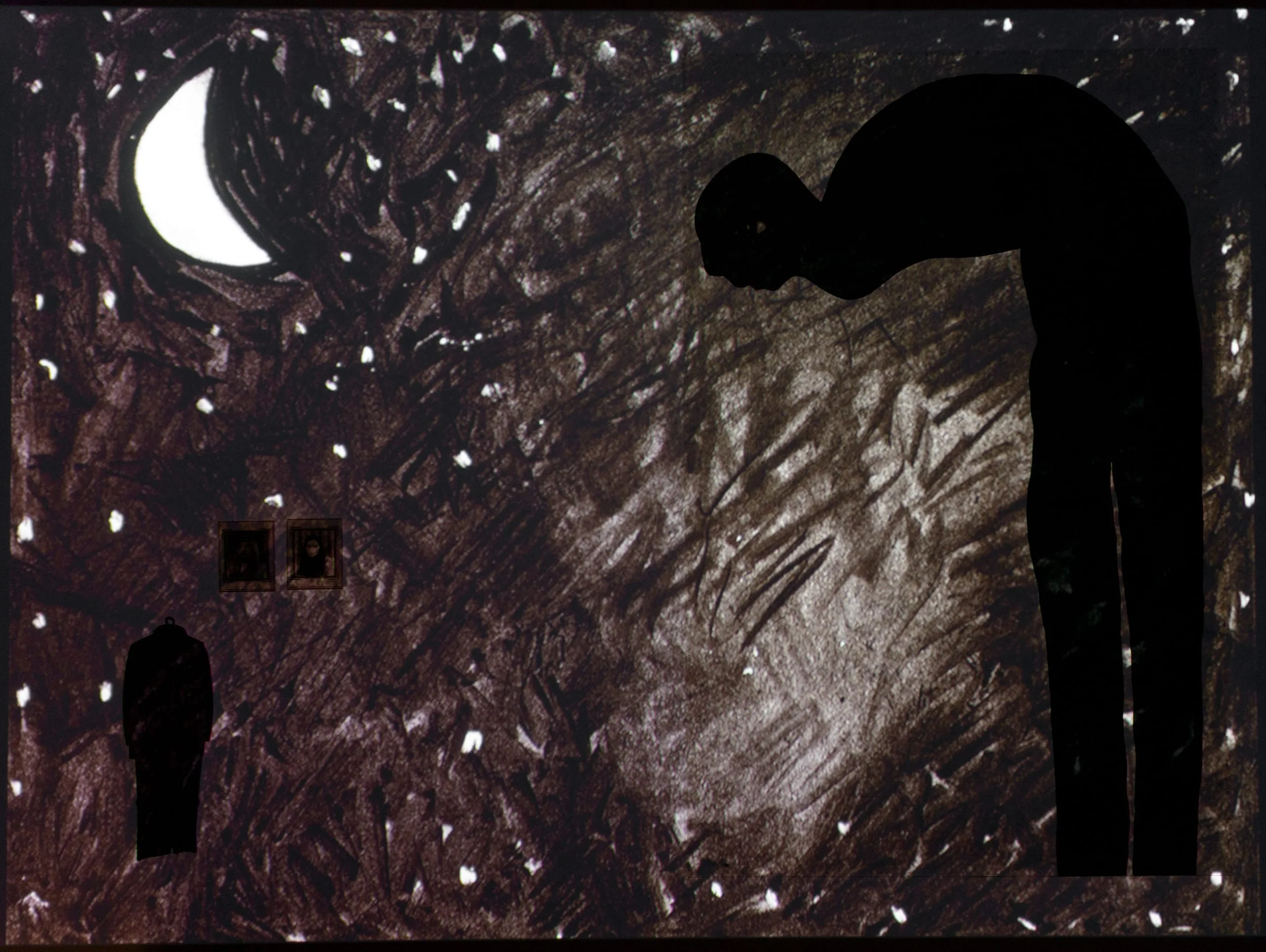artist’s parents and his father’s clothes hanging on a wall).