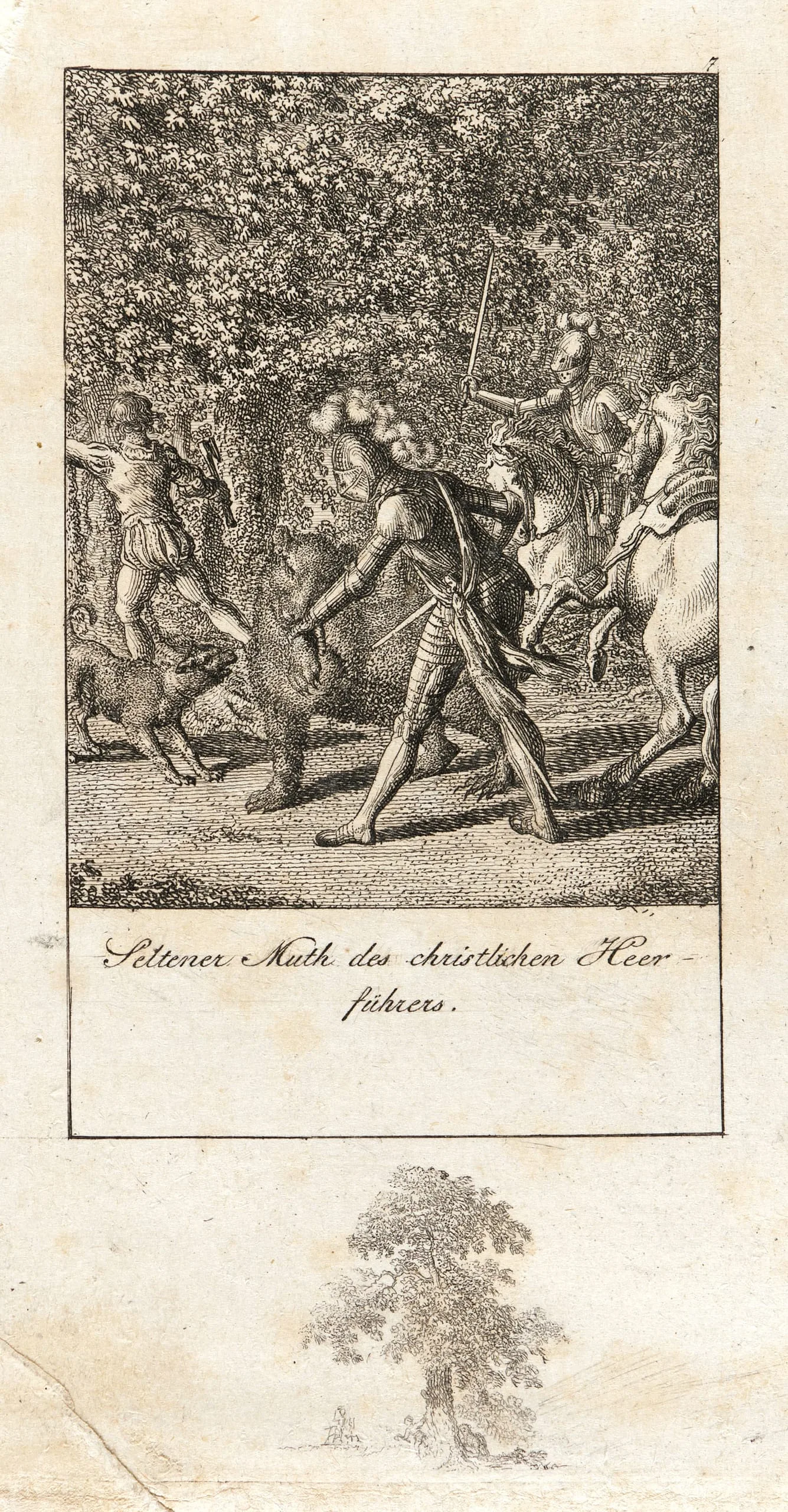 Engraving on cream paper of a battle scene with armored figures on foot and horseback at a forest edge; German cursive caption below