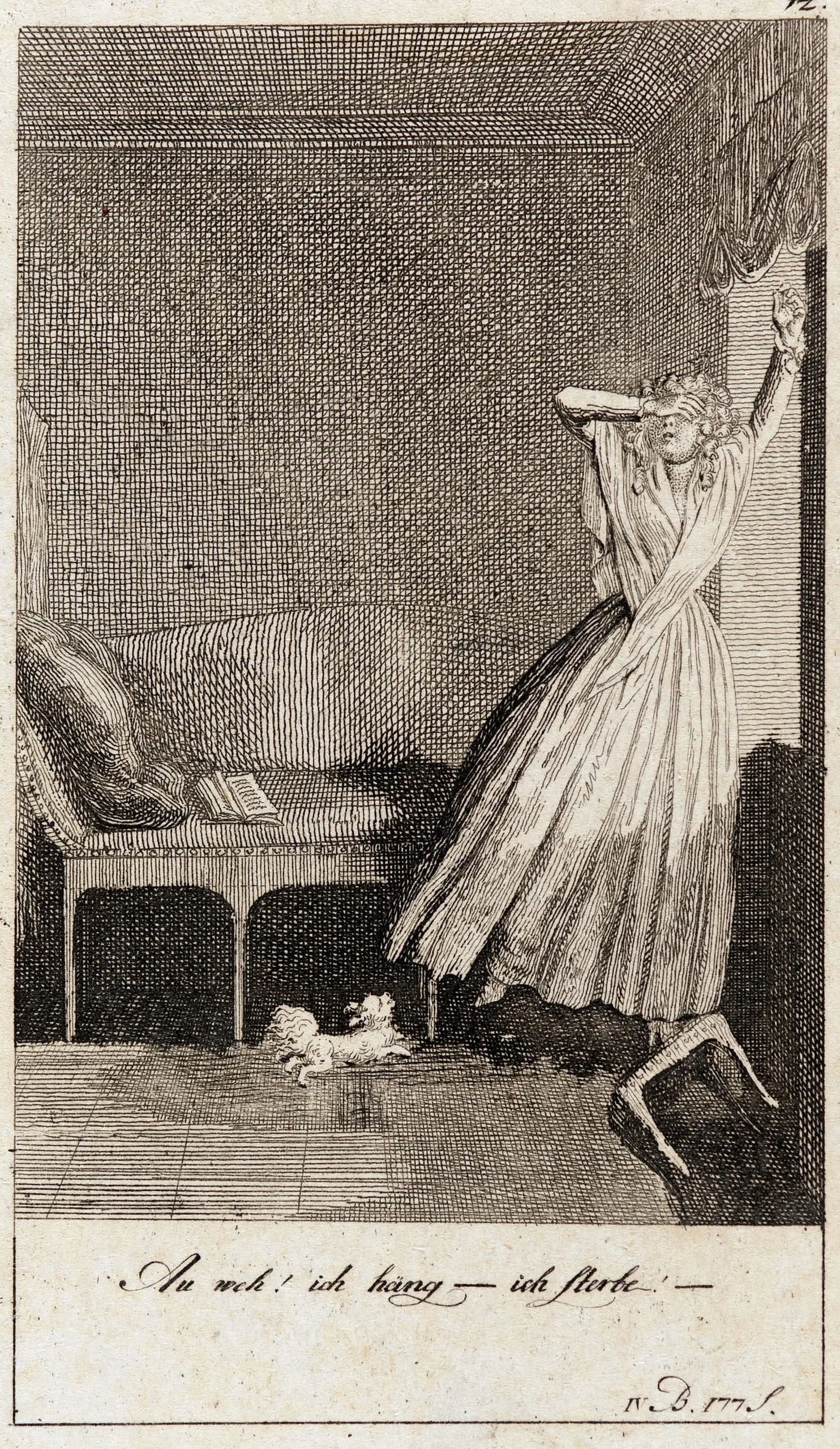 Engraving of a woman in a long gown pressed against a doorframe, arm raised, with a small dog at her feet and a daybed with an open book to her left; German caption below