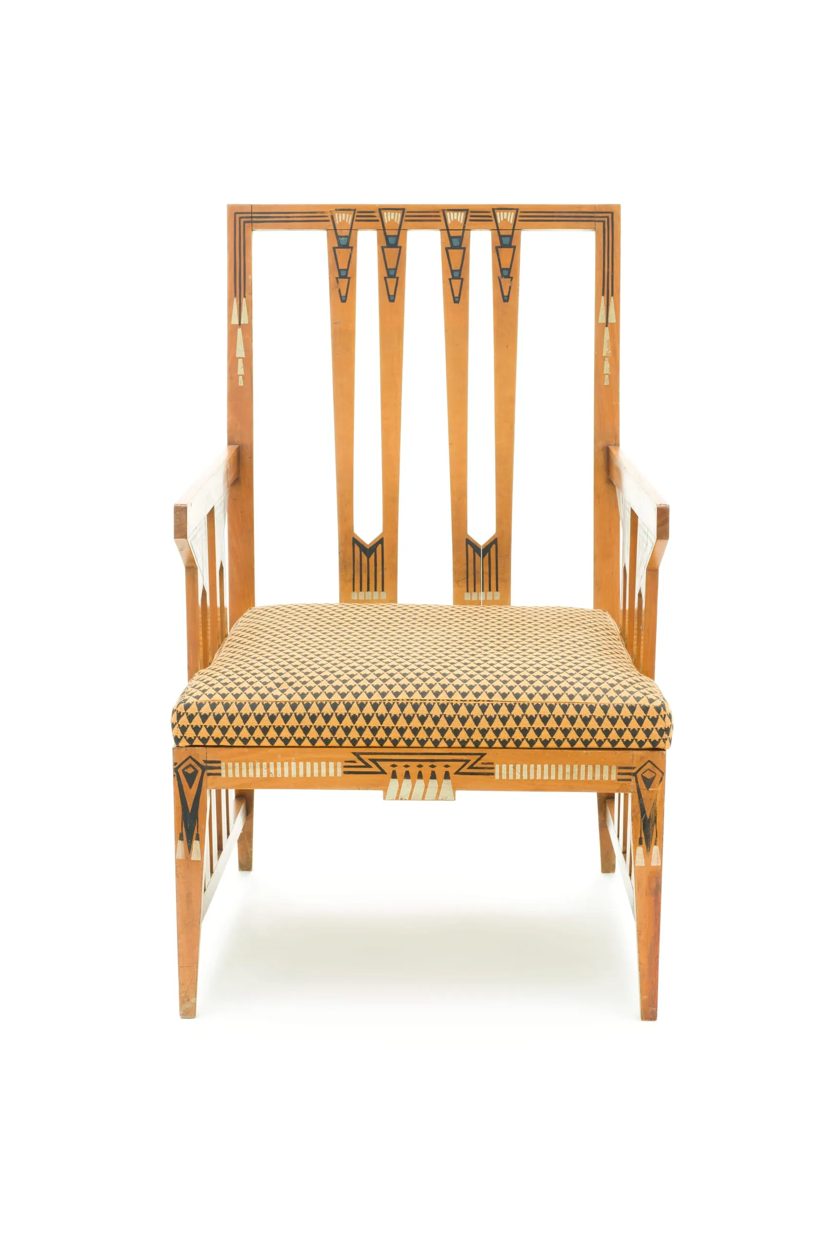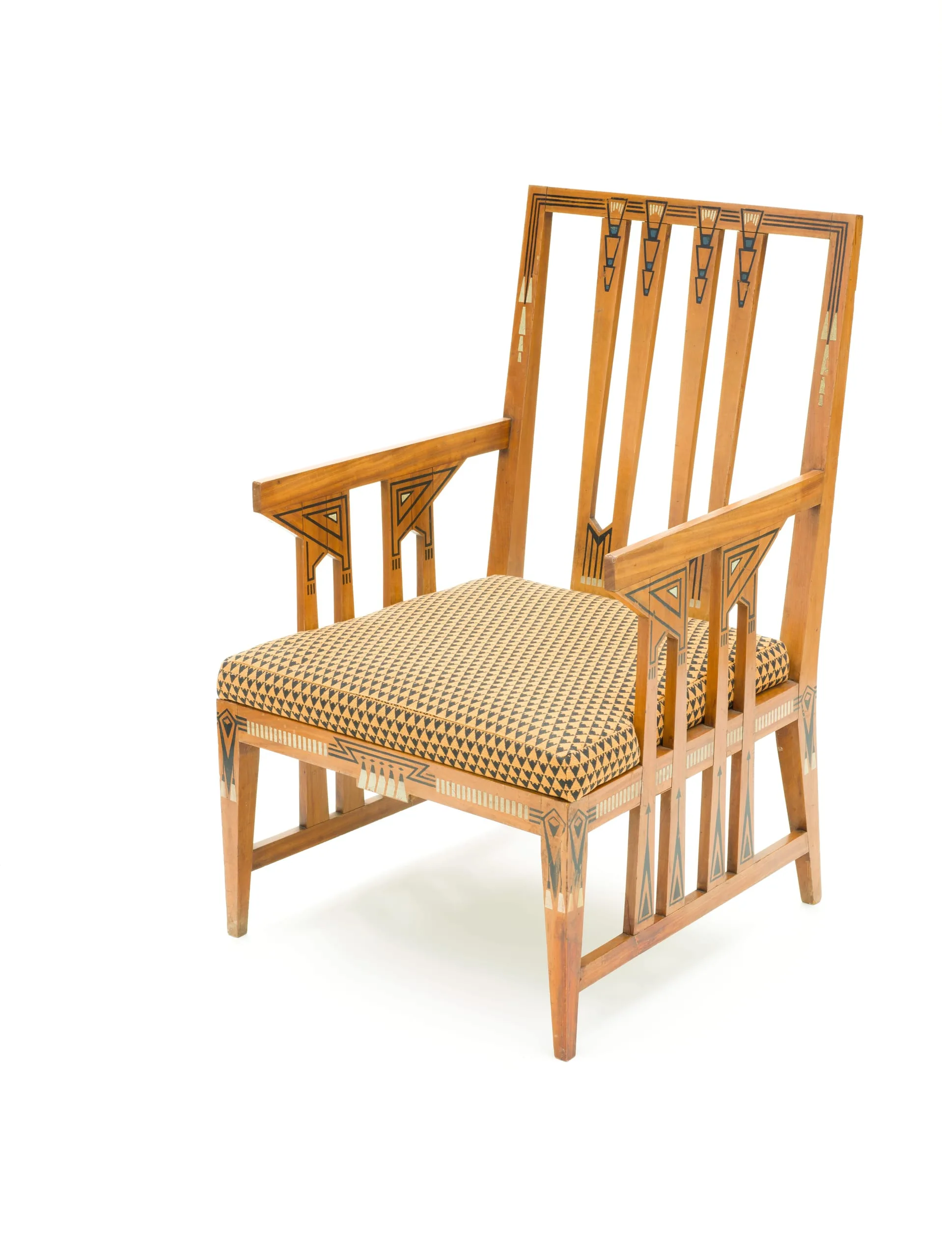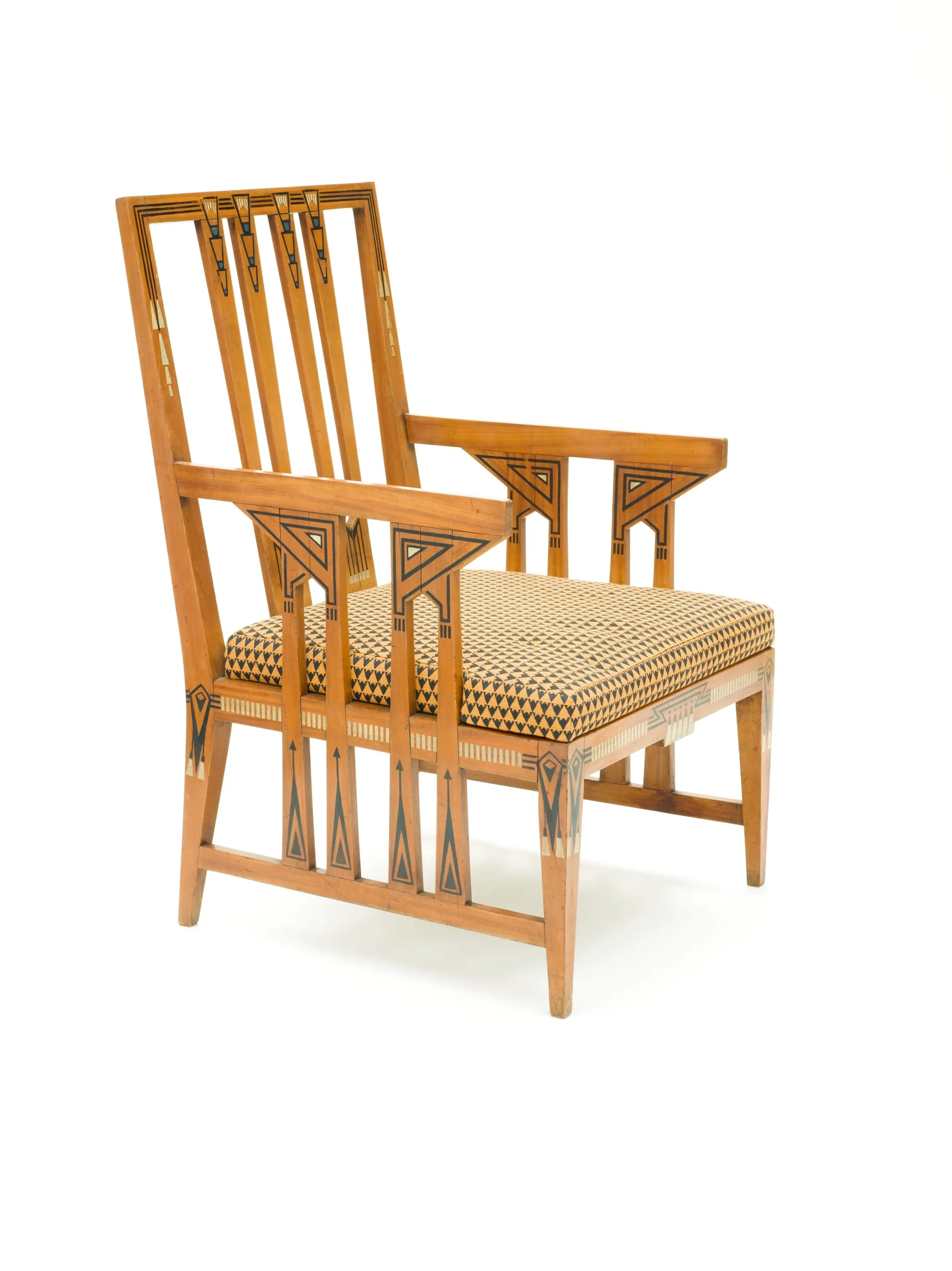 French architect Paul Auscher designed this armchair for his own home in Paris. Located at 5 rue de Talleyrand, the residence, constructed between 1910 and 1912, was part of a three-story structure intended by the architect for professional as well as private use. Designing the building as well as the furnishings, the architect created a gesamtkunstwerk (total design unity) characterized by restrained, geometric forms and ornamentation. These pieces are the only known furniture designed by Auscher; several other examples from his residence survive in the Musée d’Orsay collection.