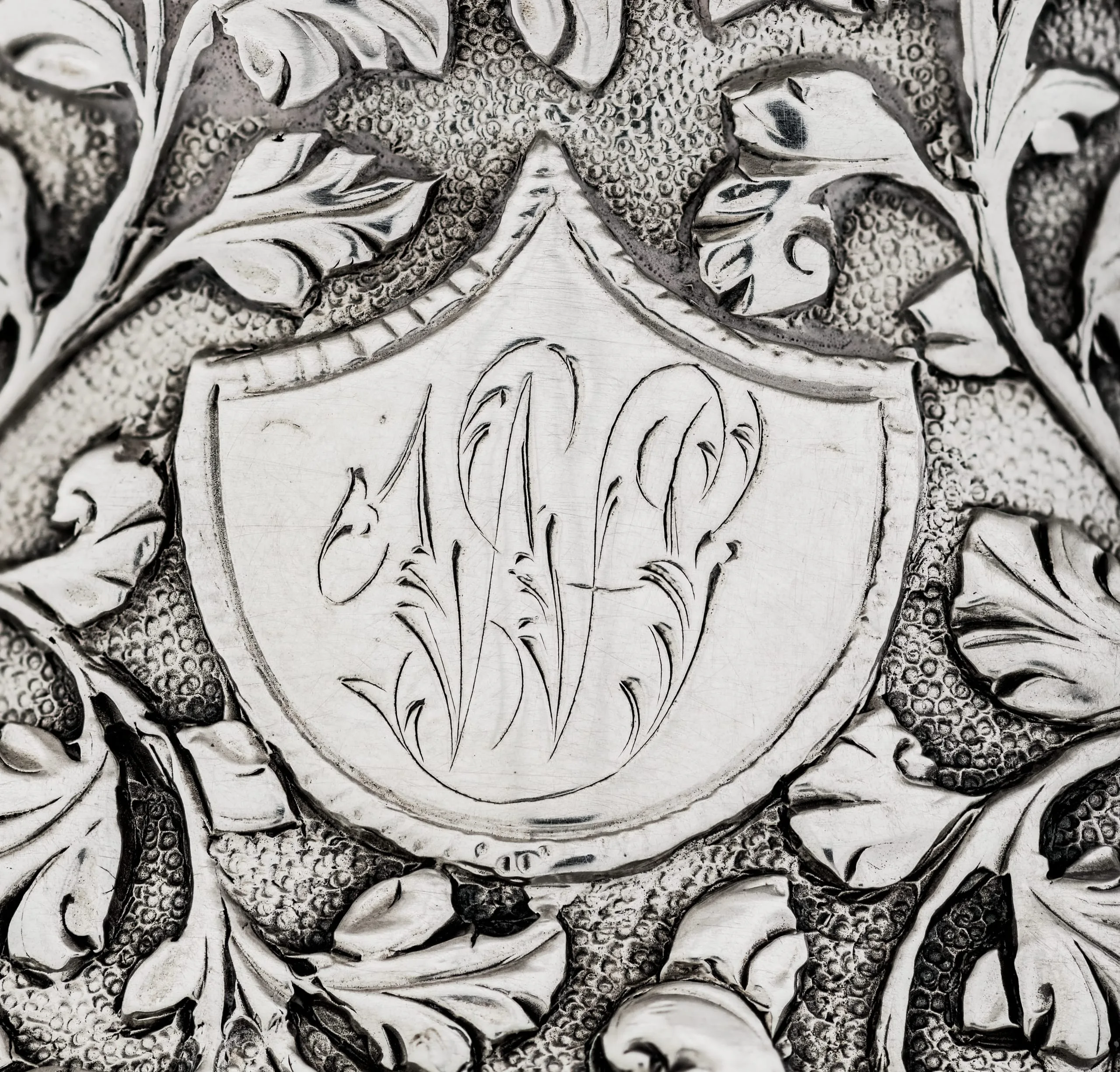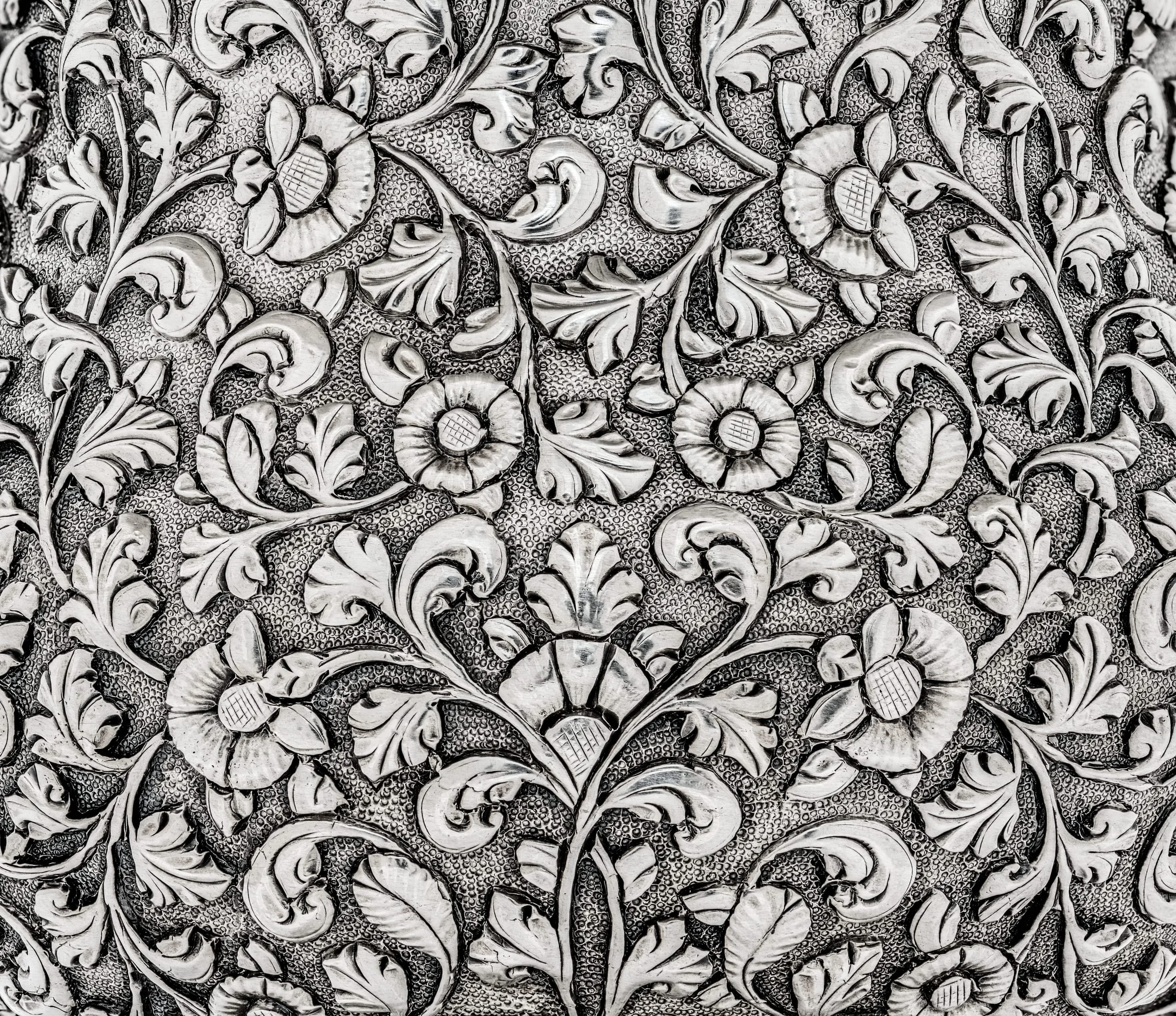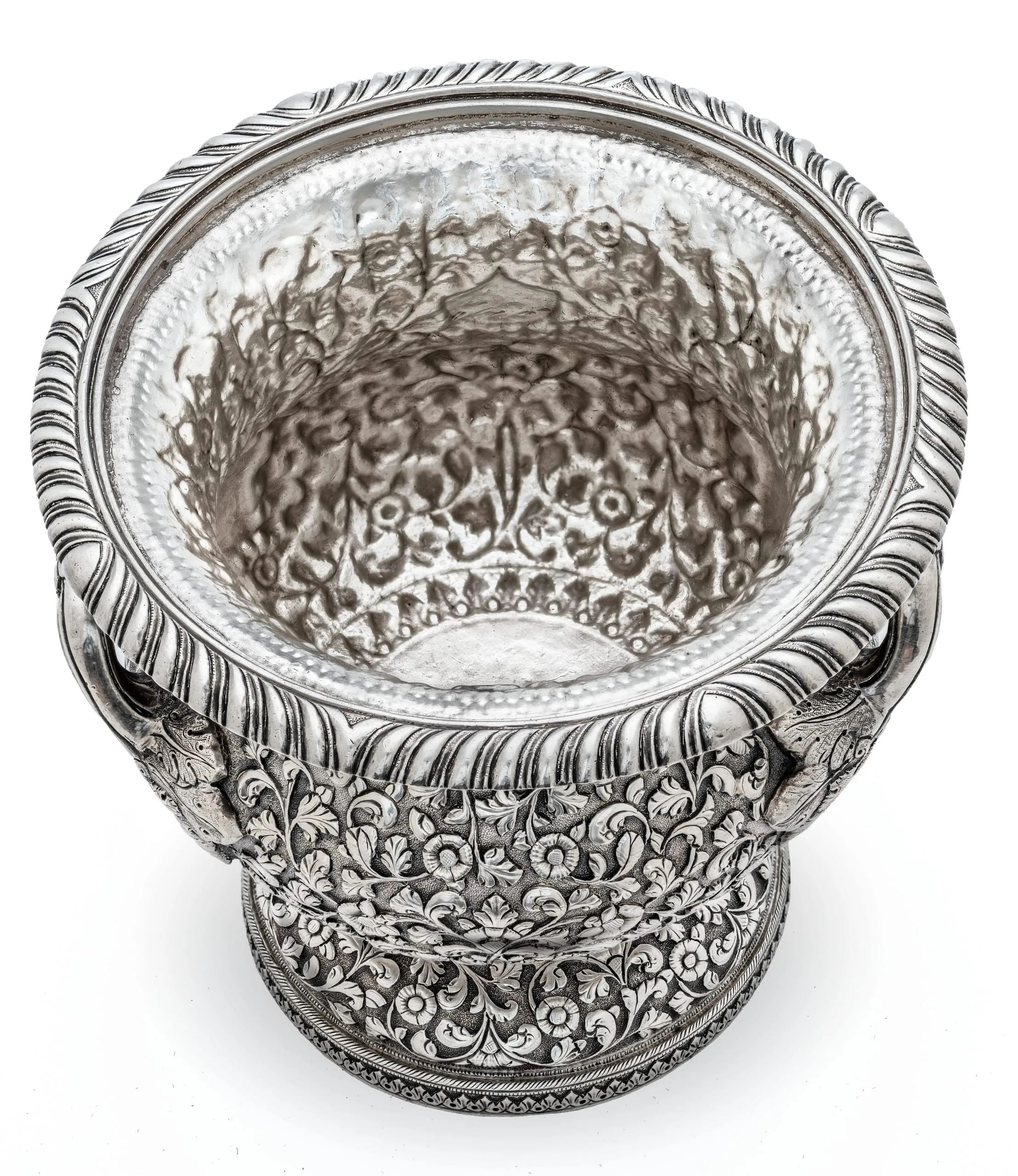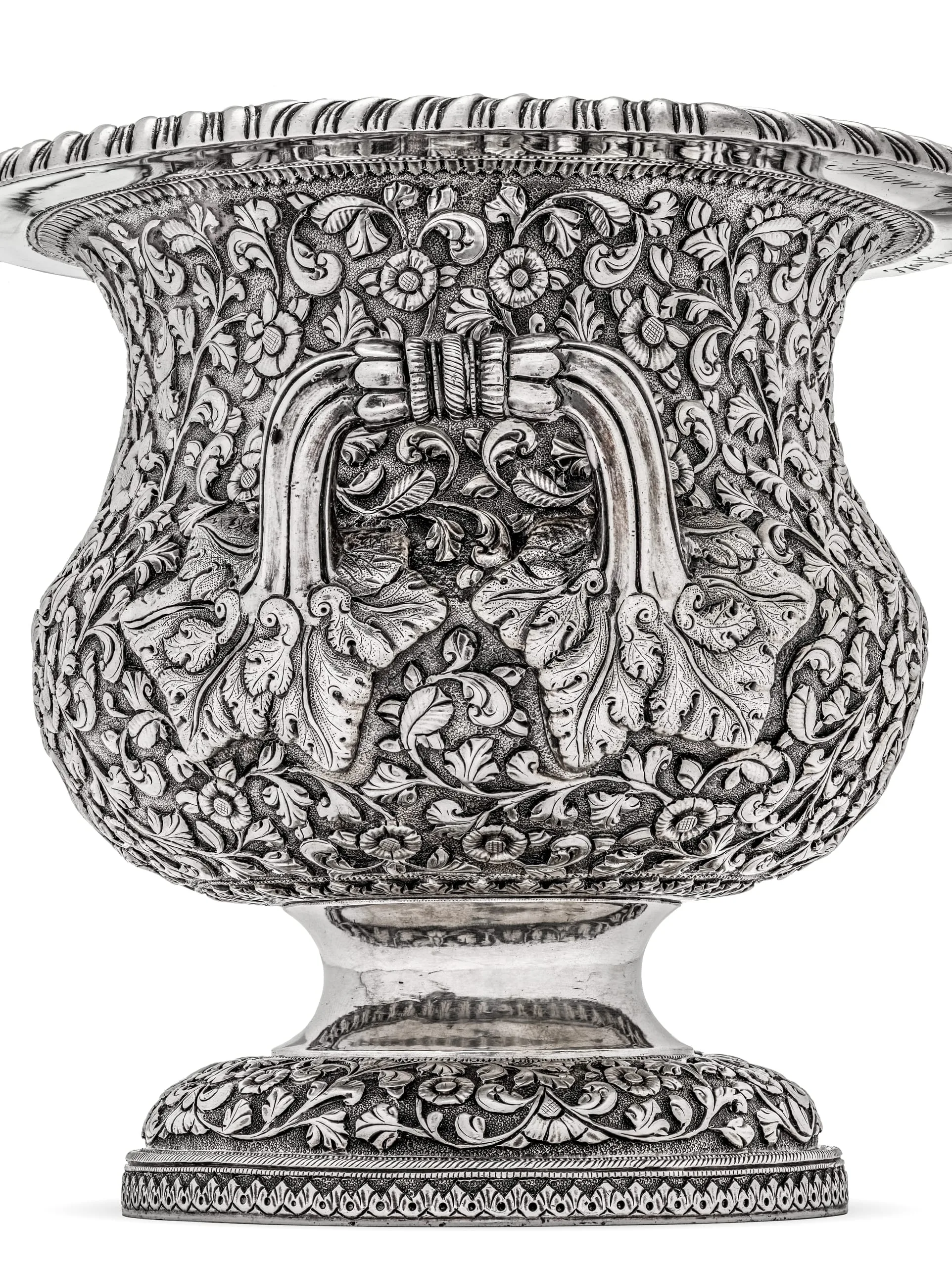 Made of heavy-gauge silver, the urn-shaped bulbous body has two opposing reeded loop handles bound, which rise from clusters of grape or hop leaves. The broad, everted lip has a gadrooned edge. The now-missing separate inner liner (likely made of silver or glass) would have held the ice. The body rests on a circular stepped pedestal foot with a plain stem and acanthus leaf and bead borders. Atop the dome-shaped cover is a two-tiered, mushroom-shaped knob. The vessel is decorated with a variant of the Kutch flowering scroll, exquisitely rendered in deep relief. There are no human, animal, or avian figures. The matte background behind the flowering scrolls was created with fine stippling made by circular punch marks.