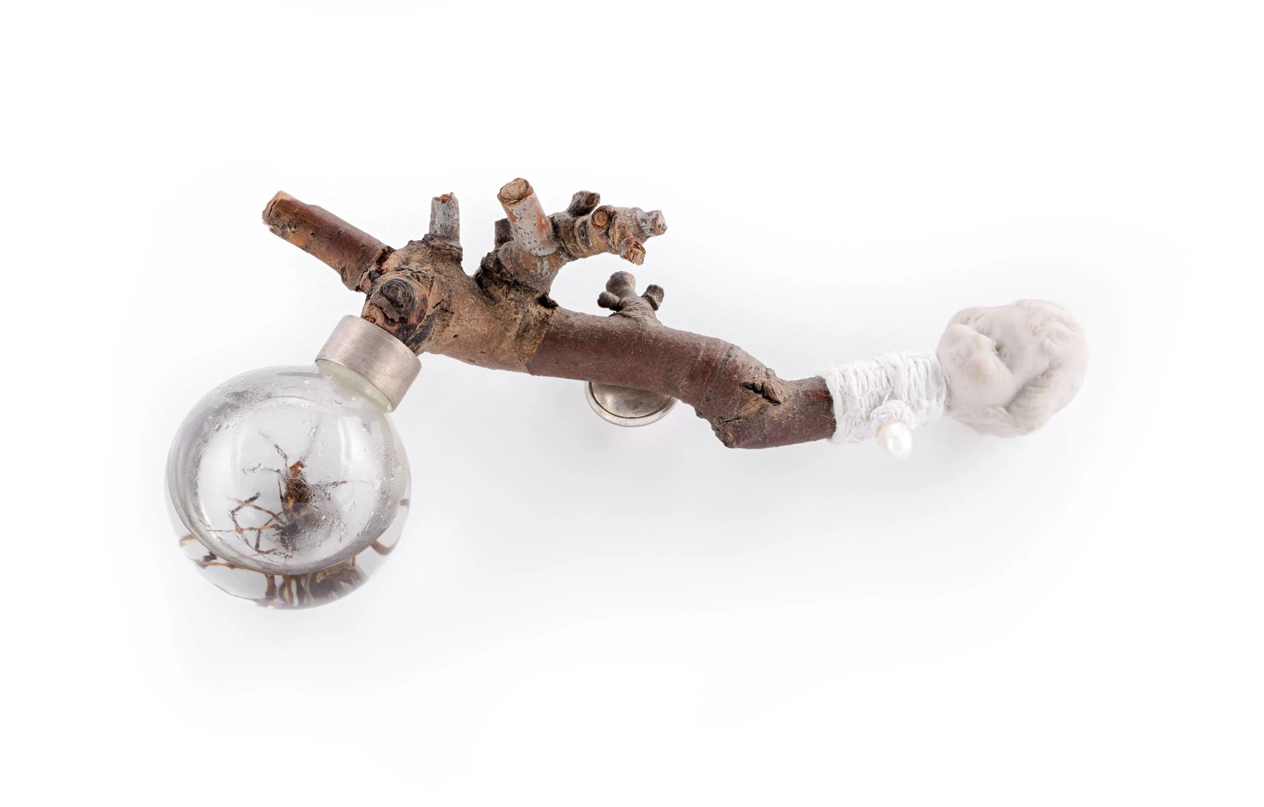 - Wood, glass, alcohol, black widow spiders, porcelain, pearl, cotton thread, silver