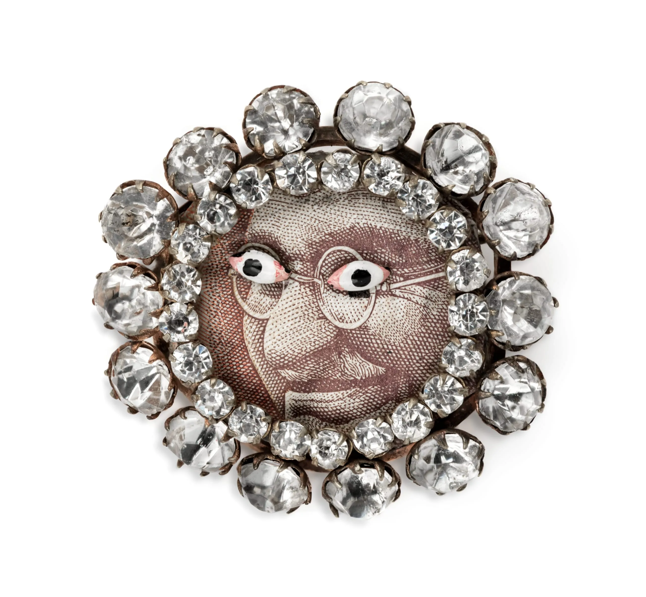 - Rhinestones, Indian paper money, brass, silver, enamel
