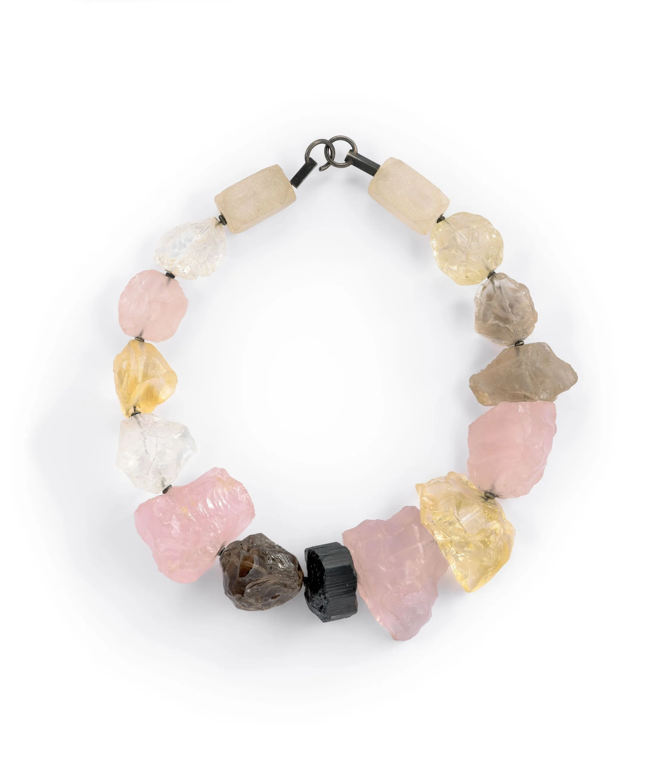 - Rose quartz, smoky quartz, quartz, citrine, tourmaline, silver