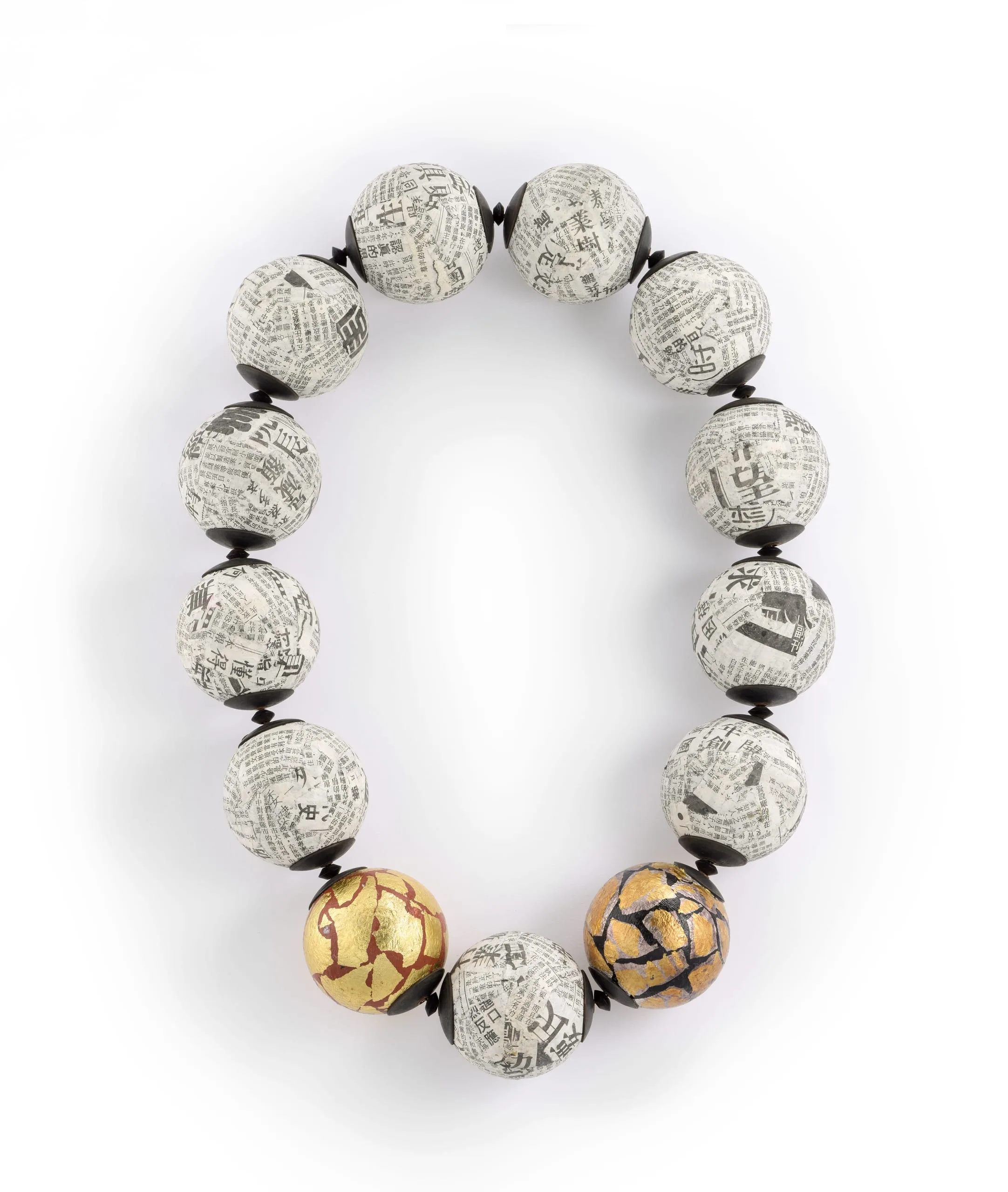 - Chinese newspaper on styrofoam, gold foil, acrylic lacquer, copper, plastic