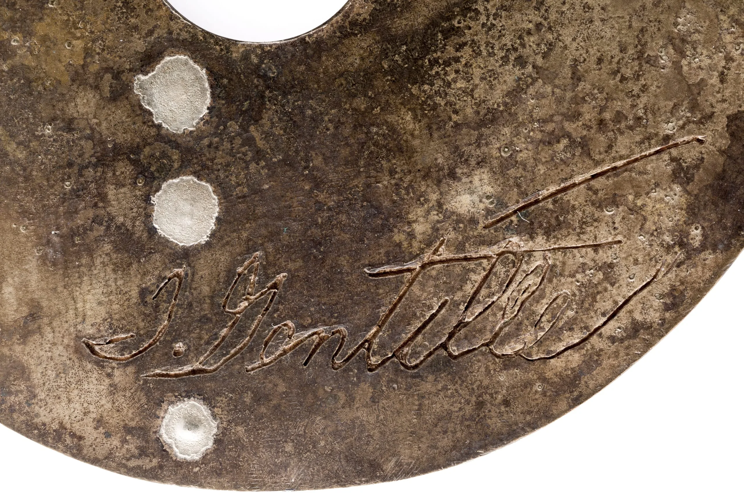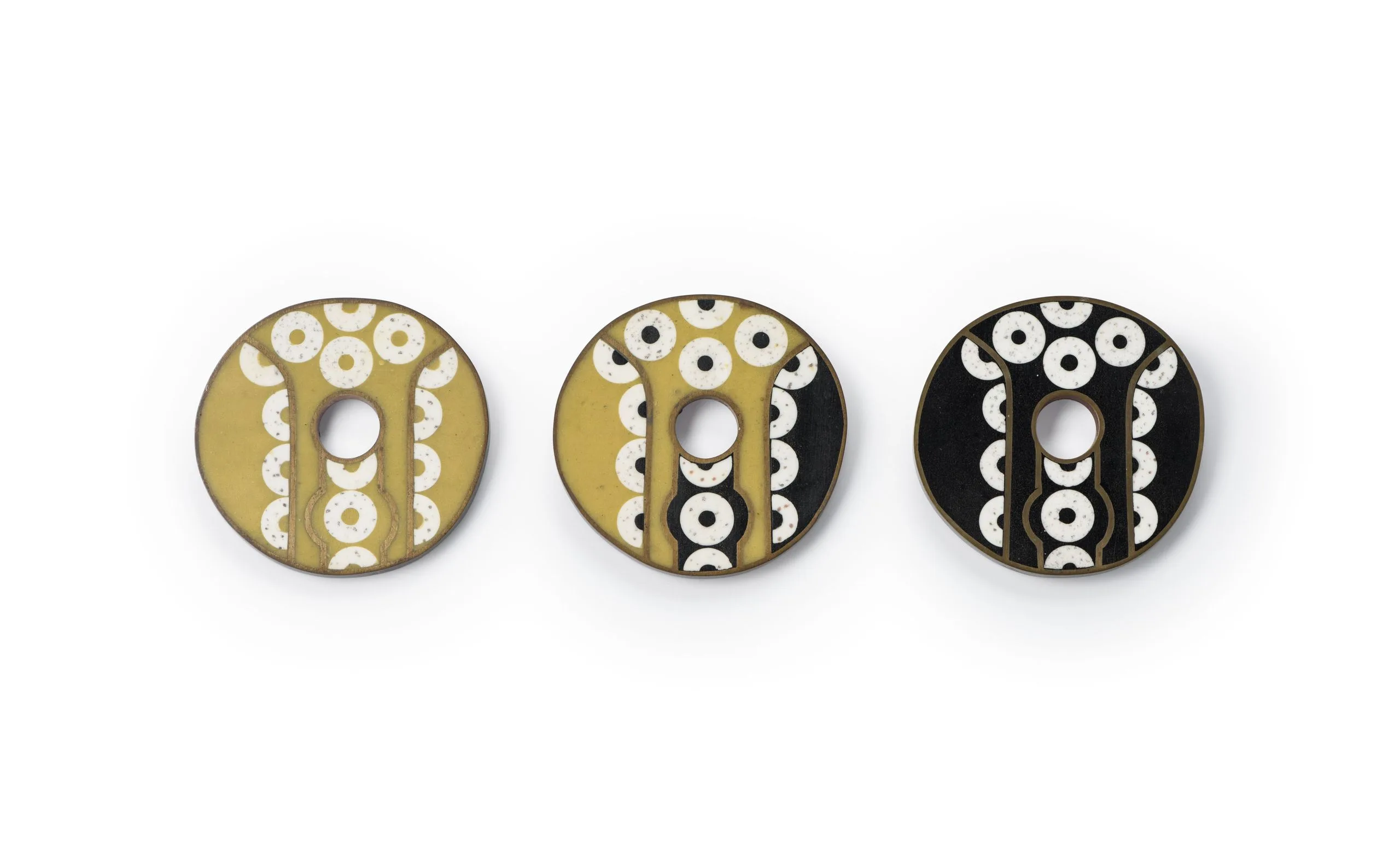 - Copper, alabaster epoxy resin, ebony epoxy resin, ostrich eggshell, gold
