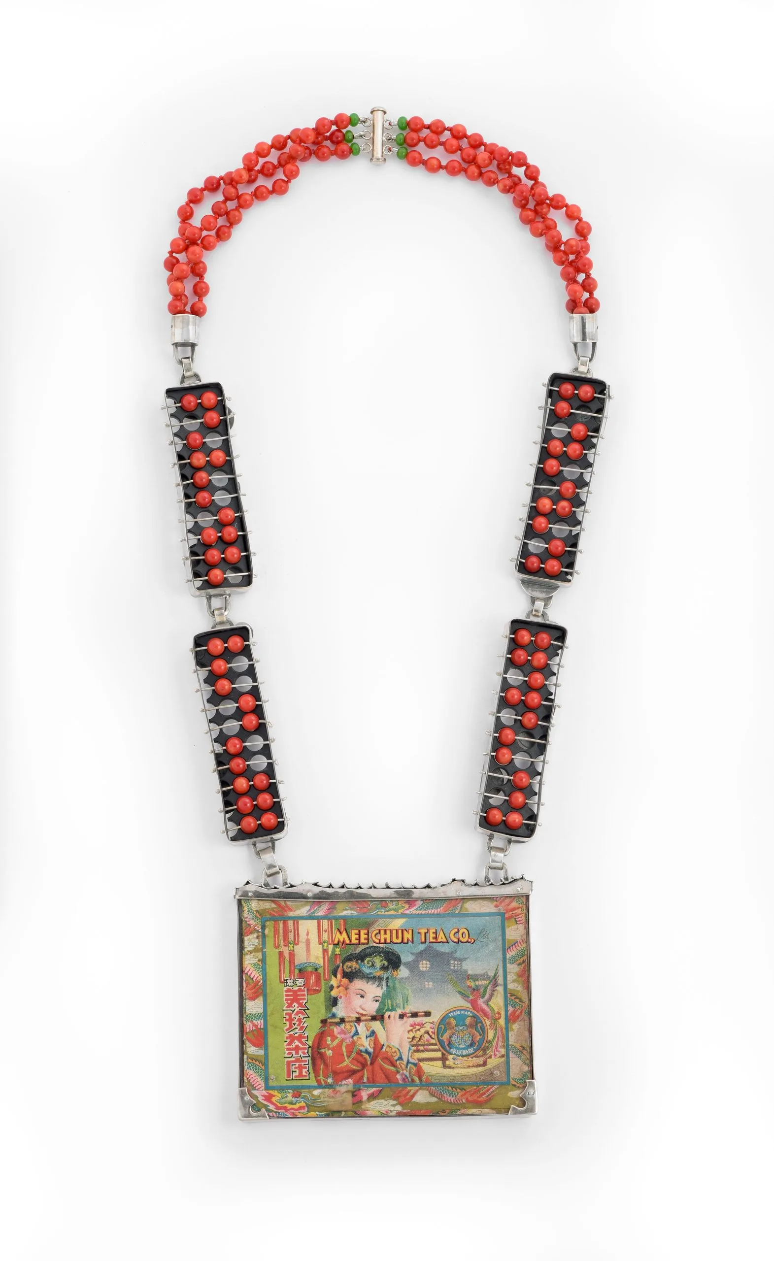 - Silver, coral, paper tea label, polymethyl methacrylate, styrene plastic, glass beads