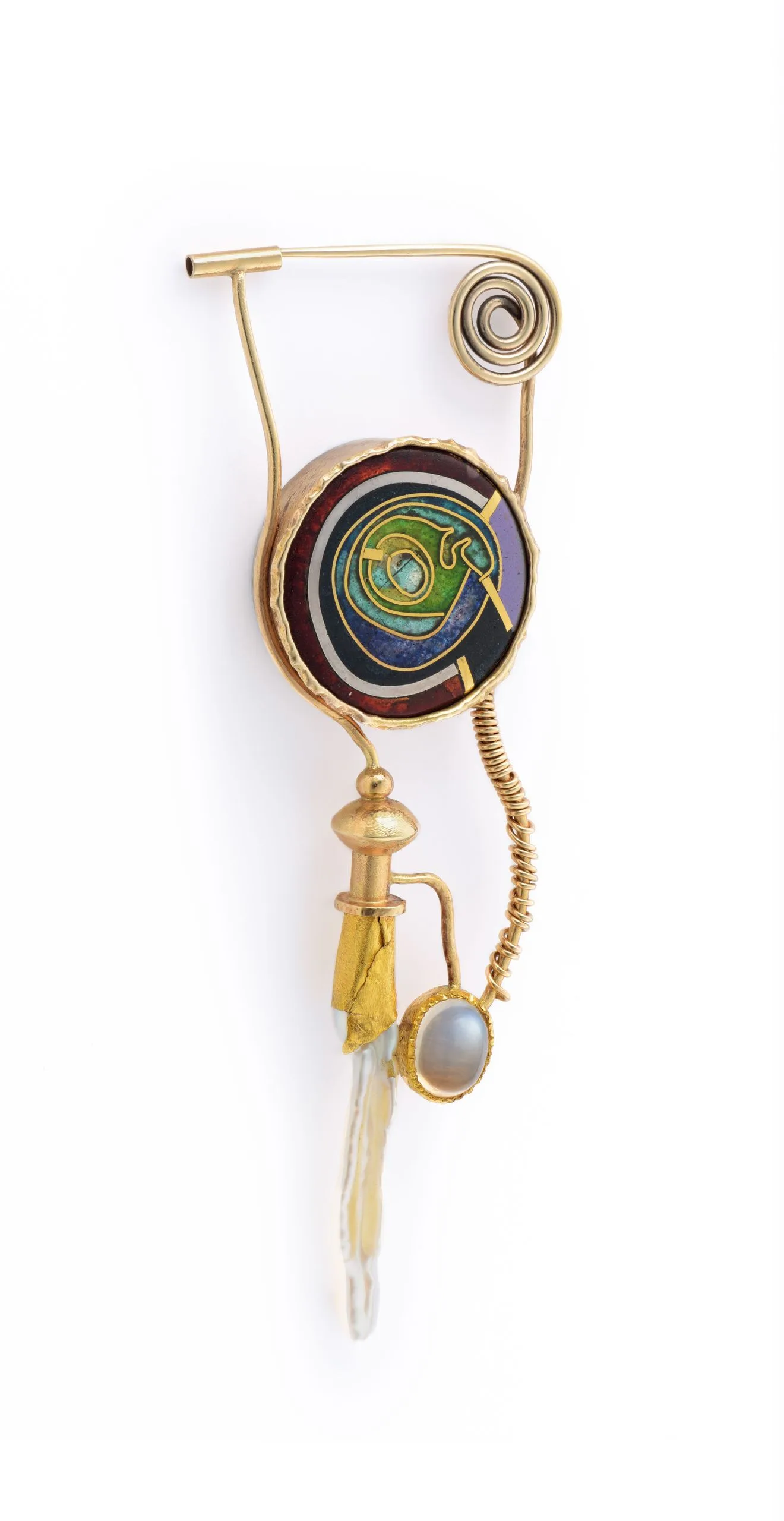 - Silver, gold, enamel on copper, pearl, moonstone