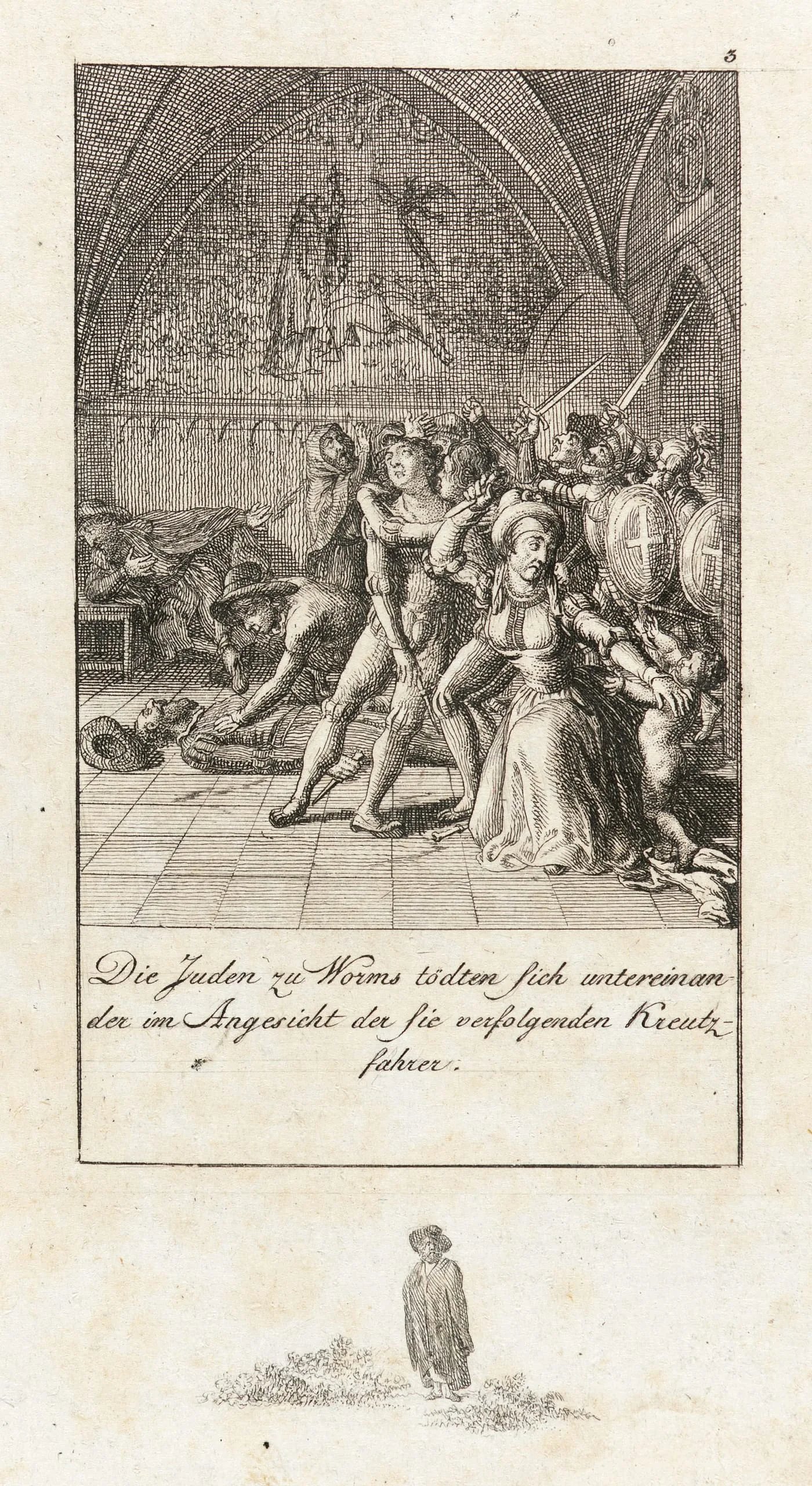 Engraving on cream paper depicting a crowded interior with armed soldiers attacking unarmed figures, with a German caption in script below