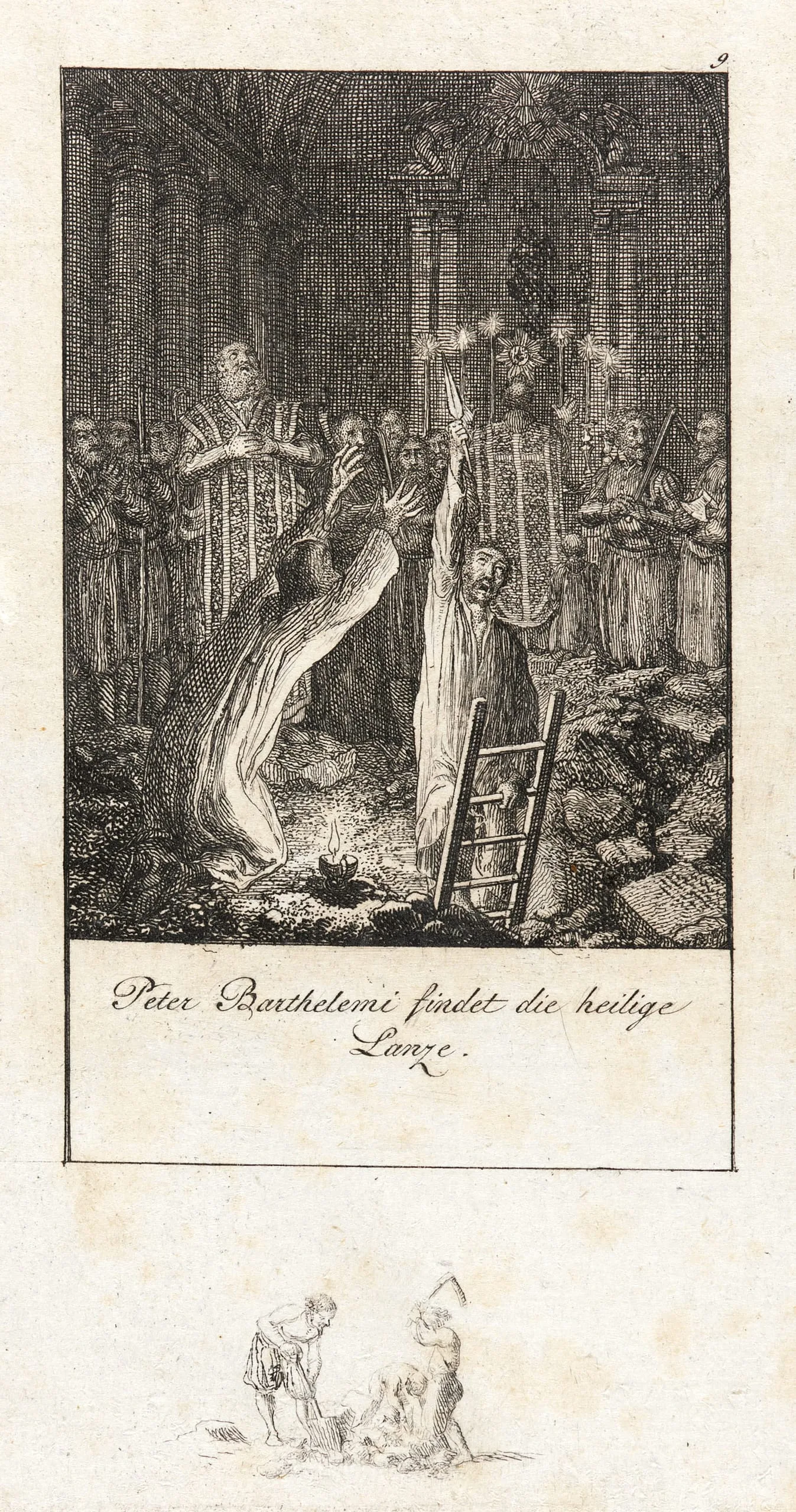 Engraving on cream paper showing robed figures in a vaulted stone interior; a central figure raises a spear aloft while another kneels near a fire; German cursive caption below