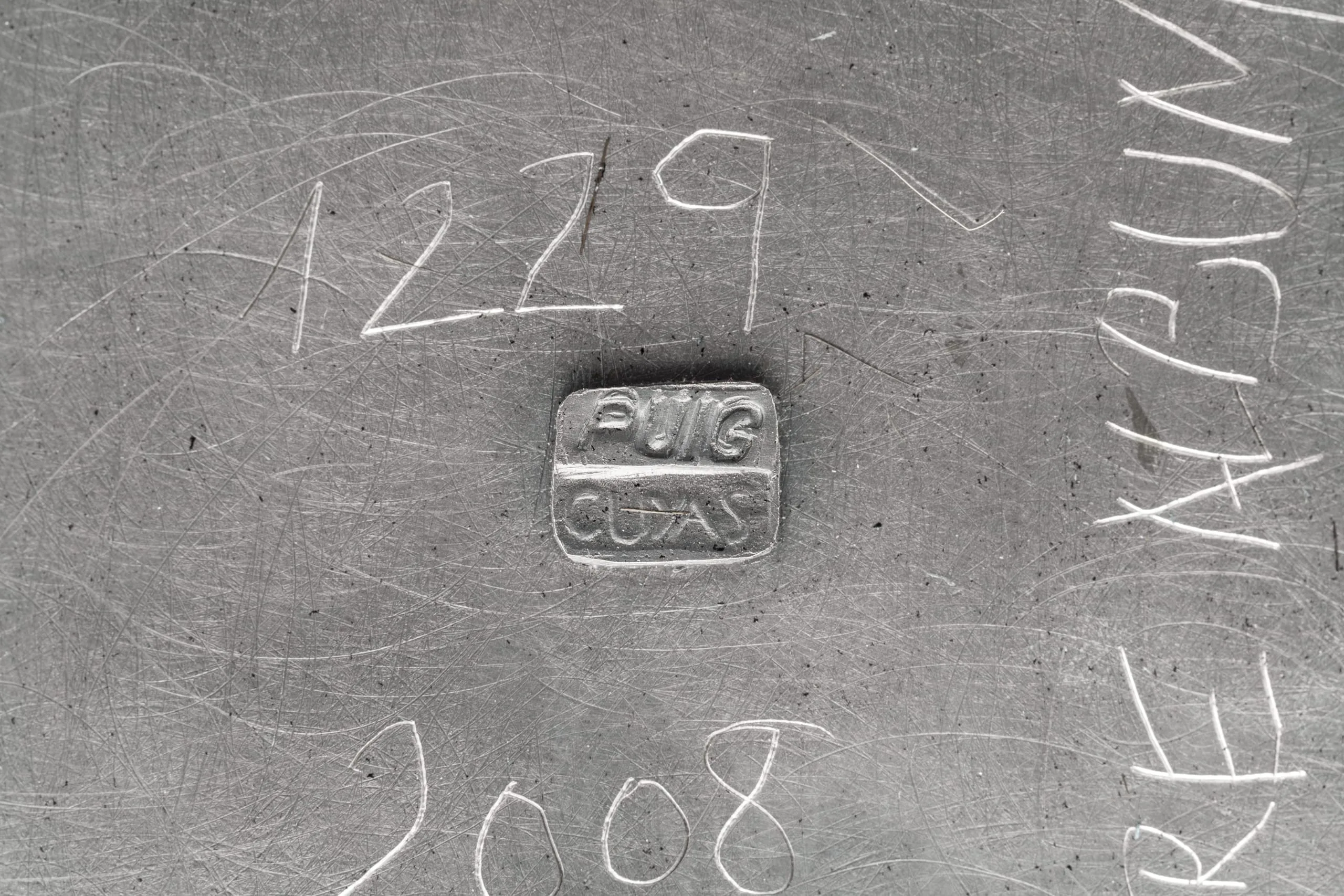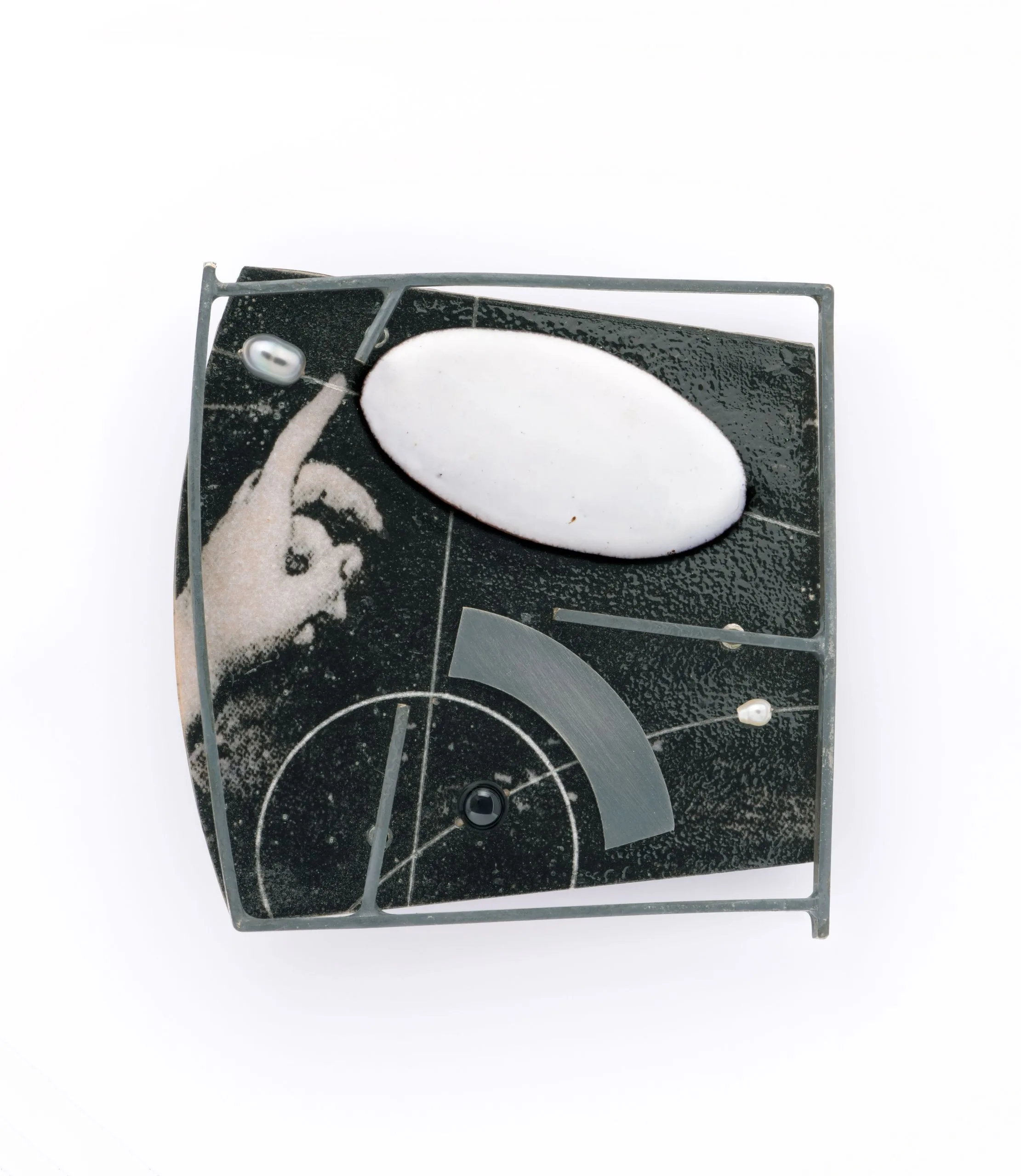 - Silver, copper alloy (nickel silver), enamel, pearls, onyx, paper with epoxy resin
