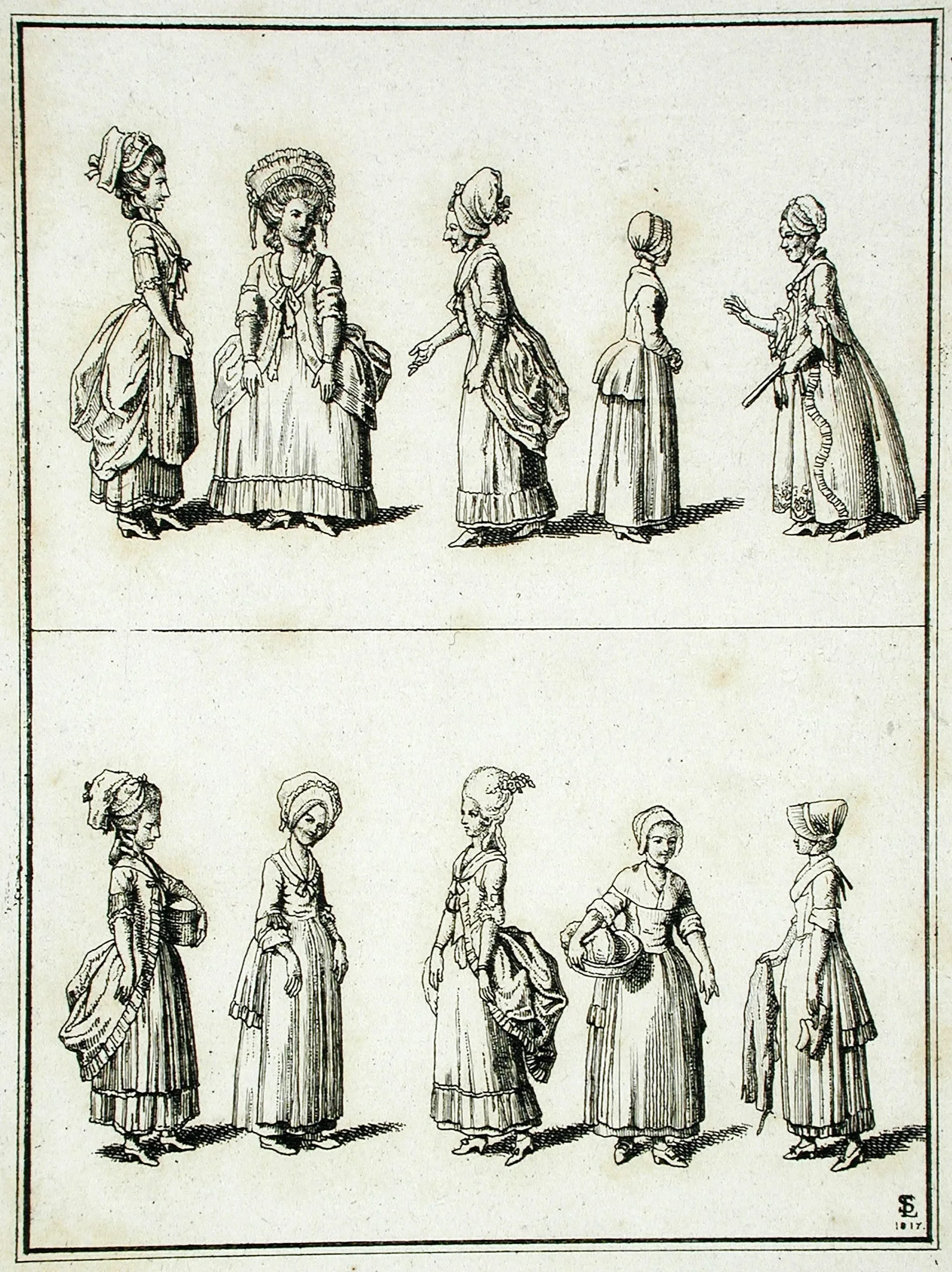 Print with fine black lines on cream paper showing two rows of full-length women in 18th-century dress, bonnets, and aprons, with crisp hatching for shading