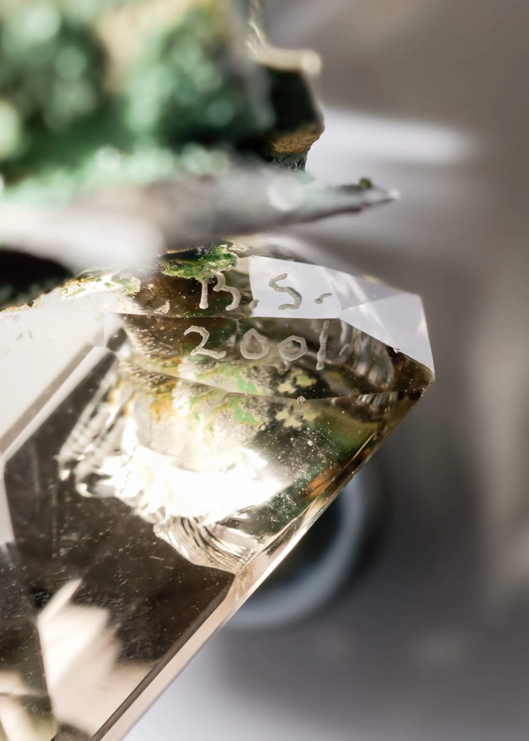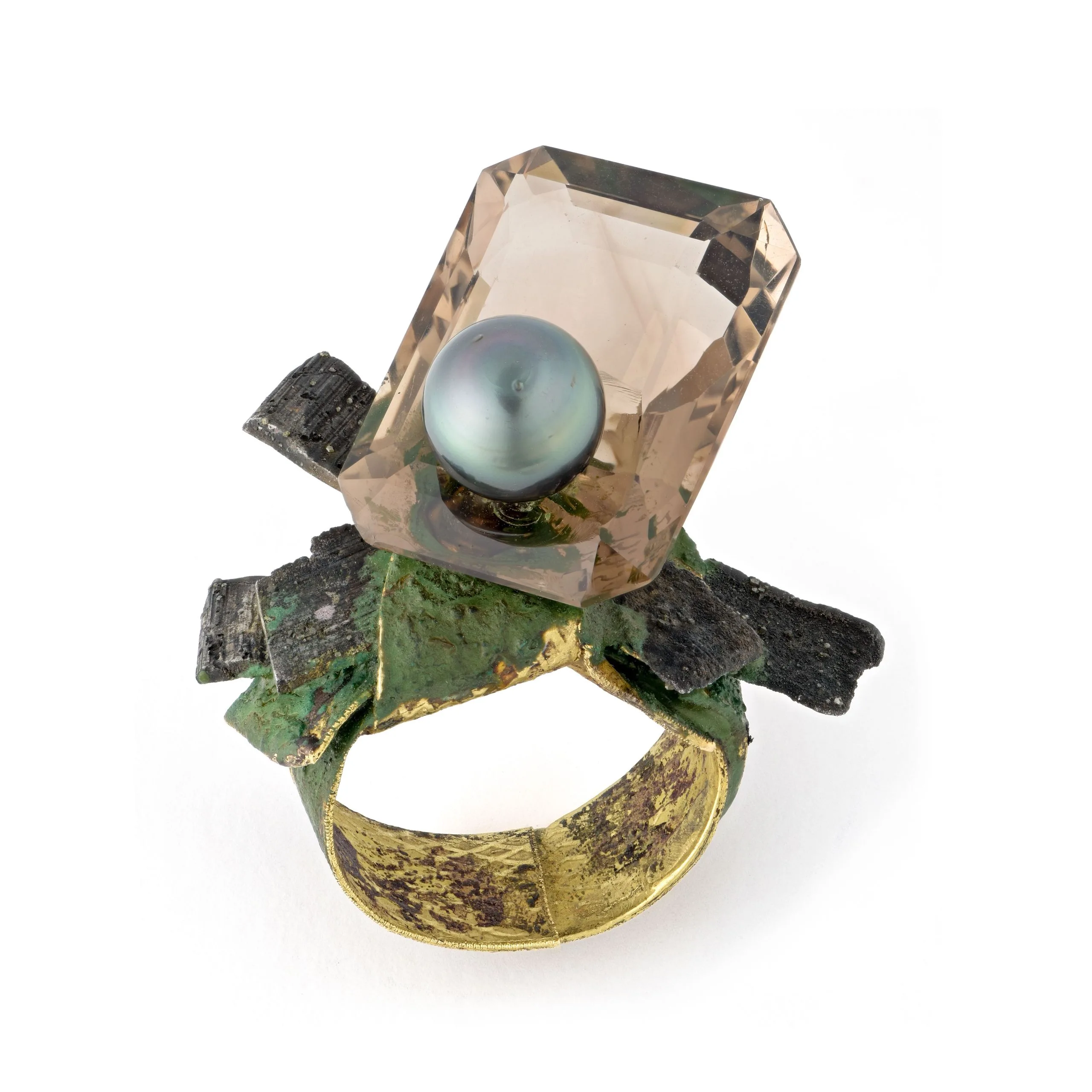 - Enamel on gold, cobalt alloy, diamond splinters, smoky quartz, pearl