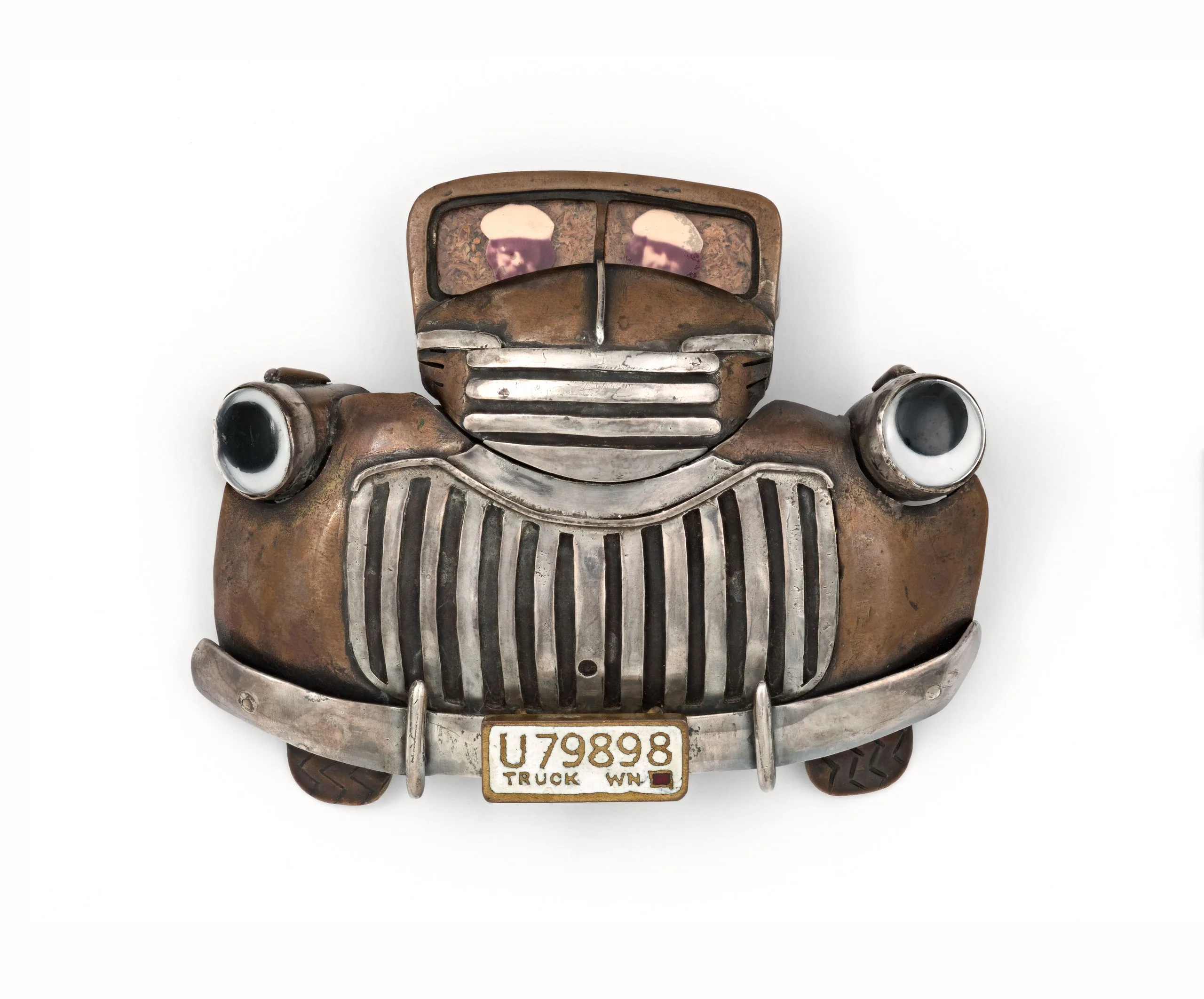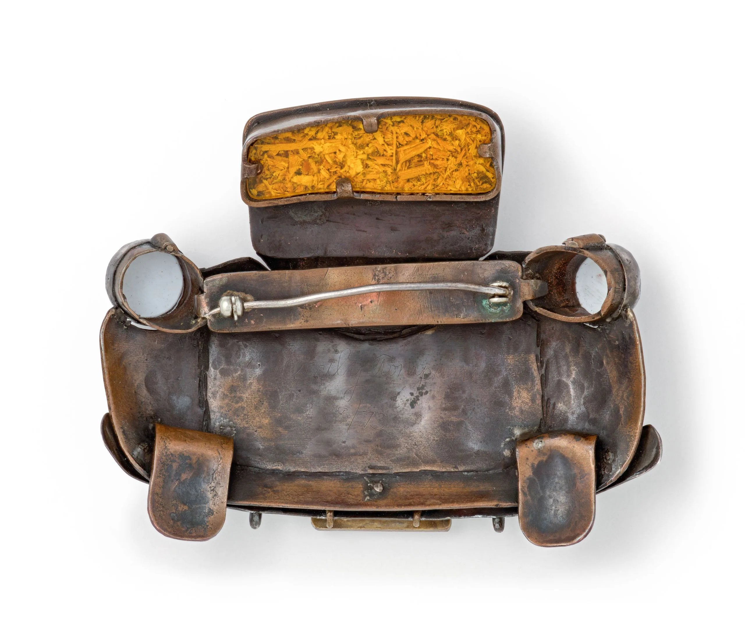 - Copper, silver, enamel, plastic eyes, photographs, polymethyl methacrylate, sawdust