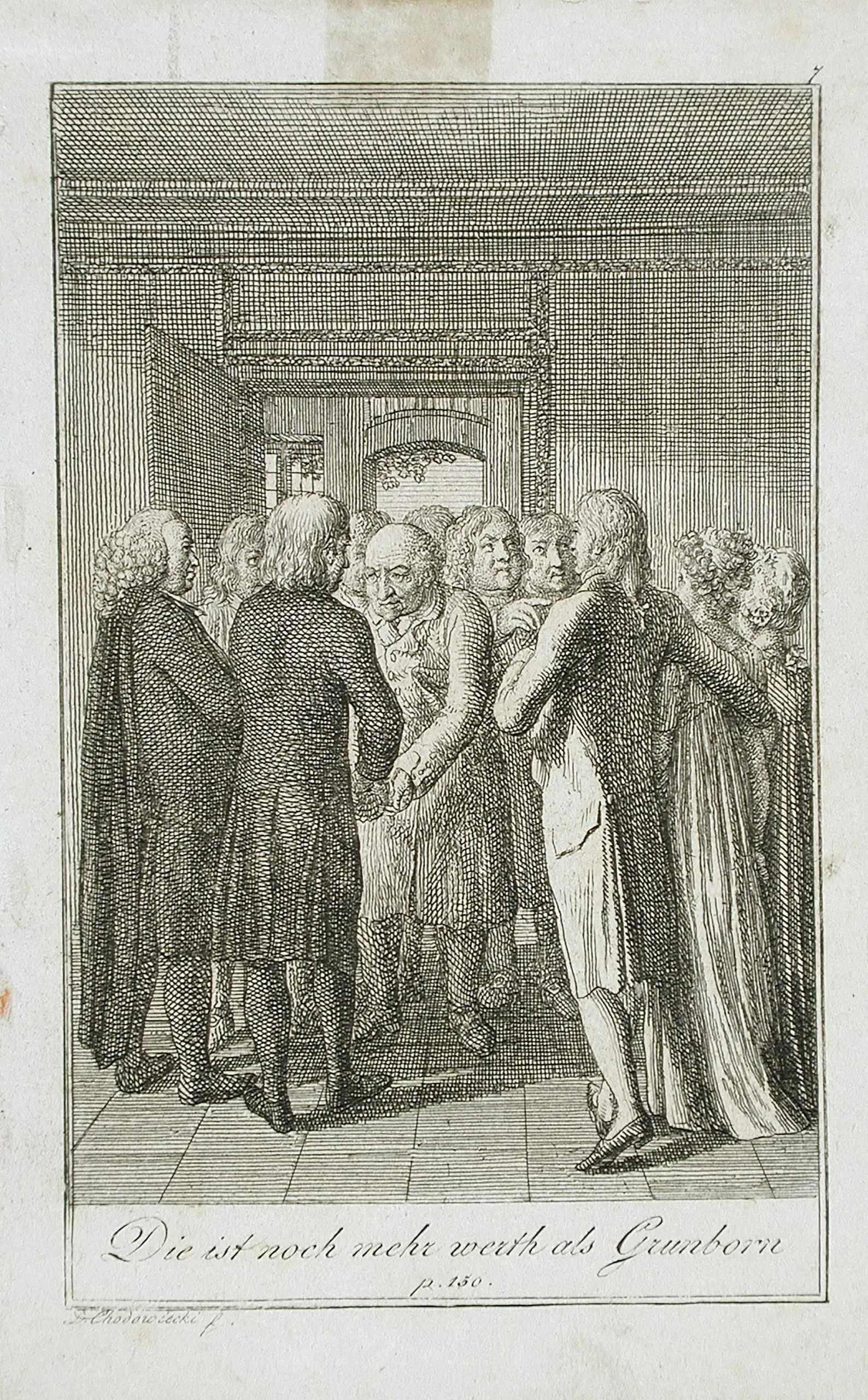Engraving on cream paper showing a crowd of ten figures in eighteenth-century dress gathered in an interior hallway, with German text below