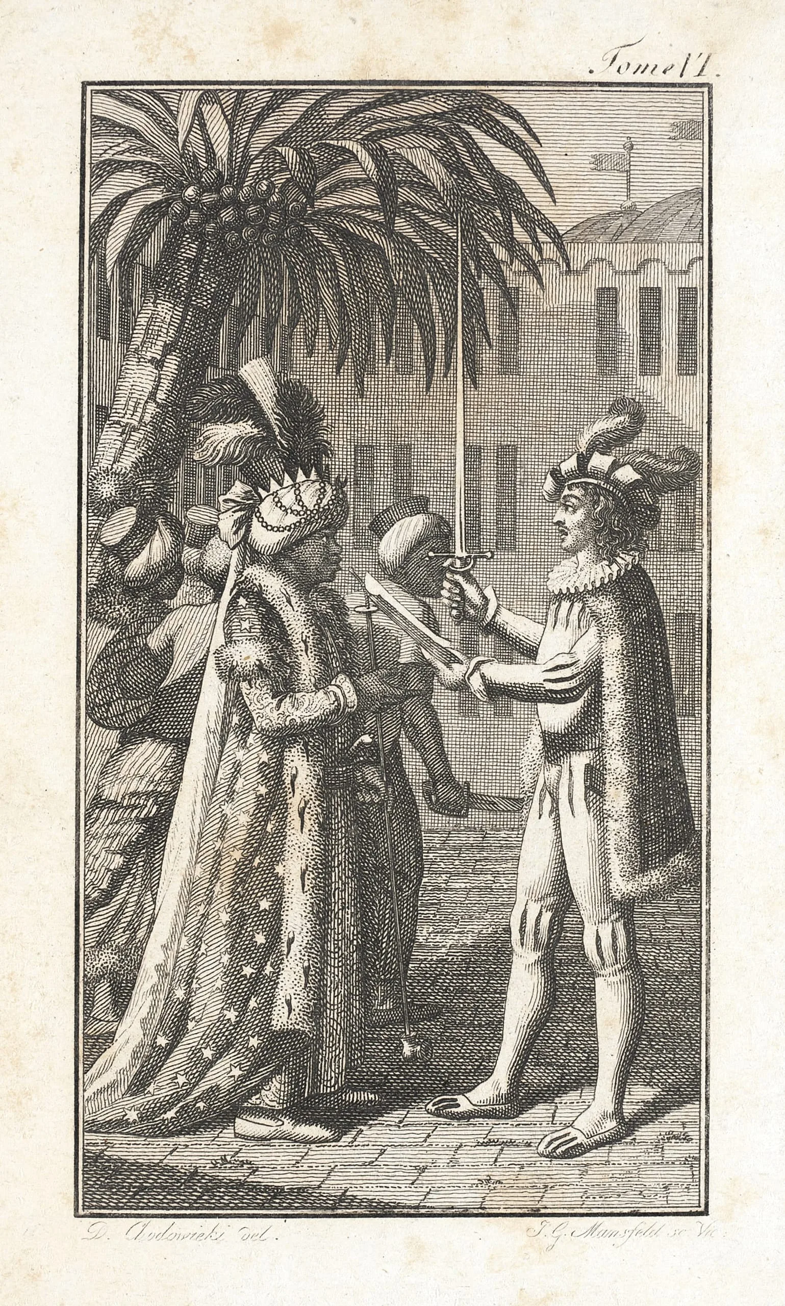 Engraving of three costumed figures exchanging a document outdoors, with a palm tree and flat-roofed building behind them; fine crosshatched lines on cream paper