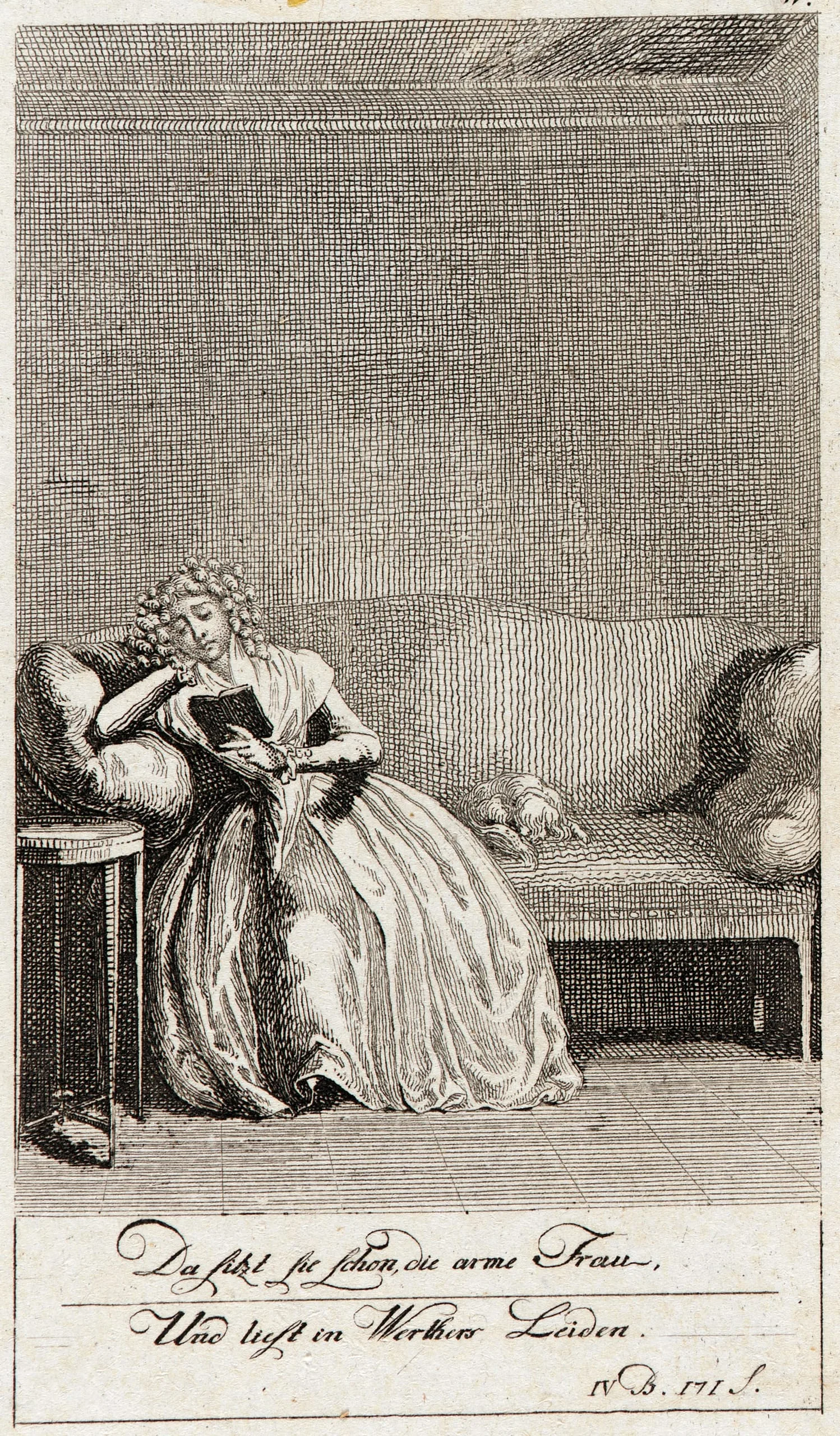 Engraving of a woman in a flowing gown seated beside a sofa, reading a small book, with German script below the image